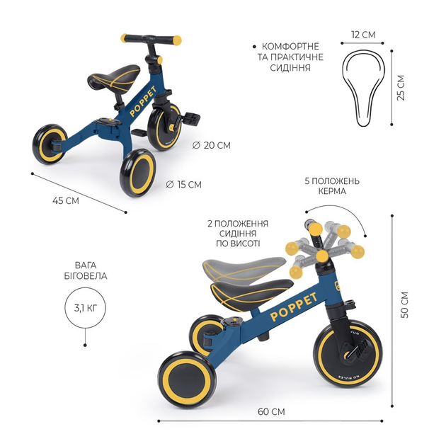 Опис продуктуБіговел POPPET 3 в 1 — ідеальний вибір для дітей від 1 до 4 років. Цей триколісний біговел поєднує безпеку, комфорт та можливість трансформації, що робить його чудовим засобом для активного розвитку малюка.