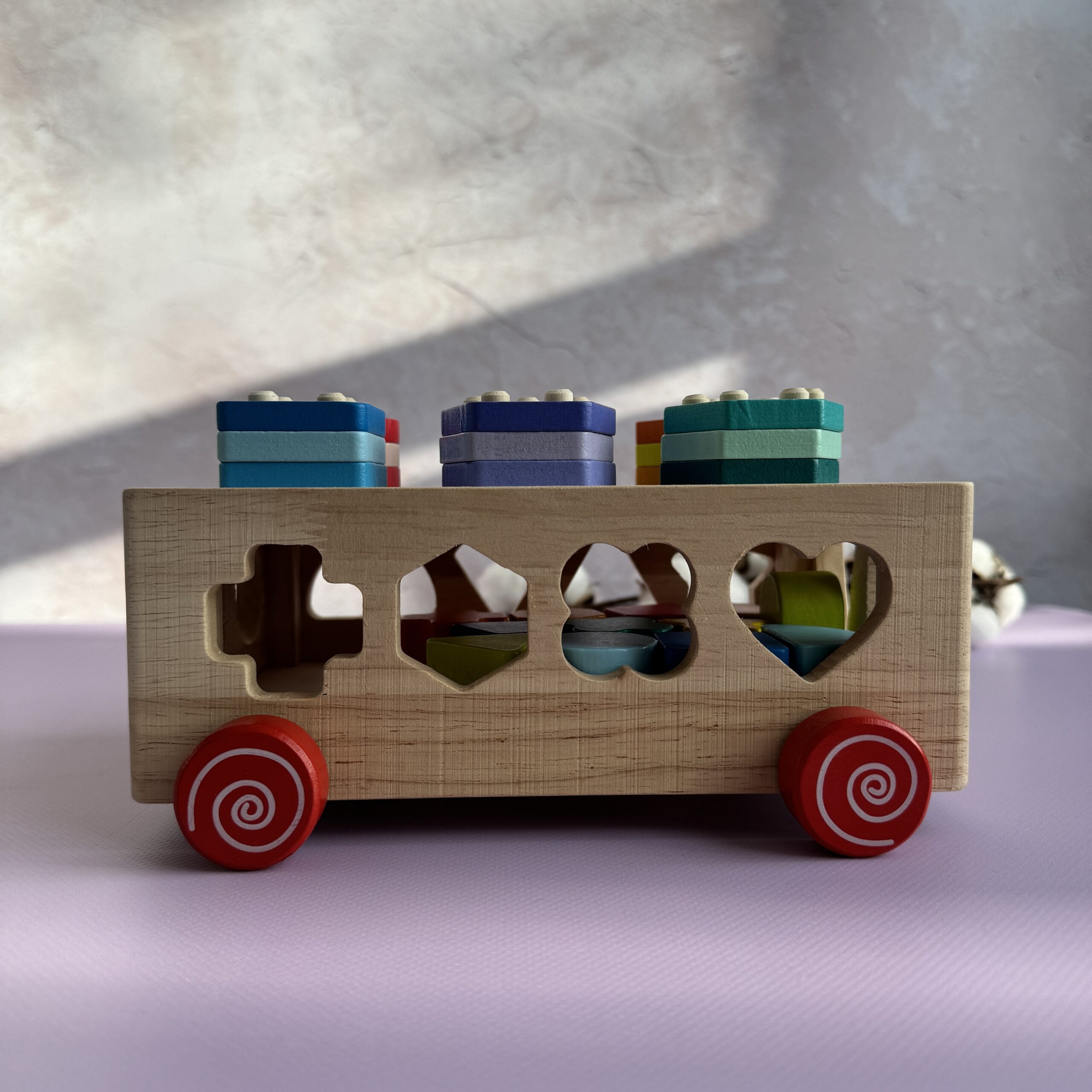 Ця яскрава дерев’яна іграшка стане справжнім відкриттям для вашої дитини! Вона поєднує три захопливі активності — тематичну гру, сортер і каталку. Малюк не лише весело проведе час, а й отримає перші знання про форми та кольори.