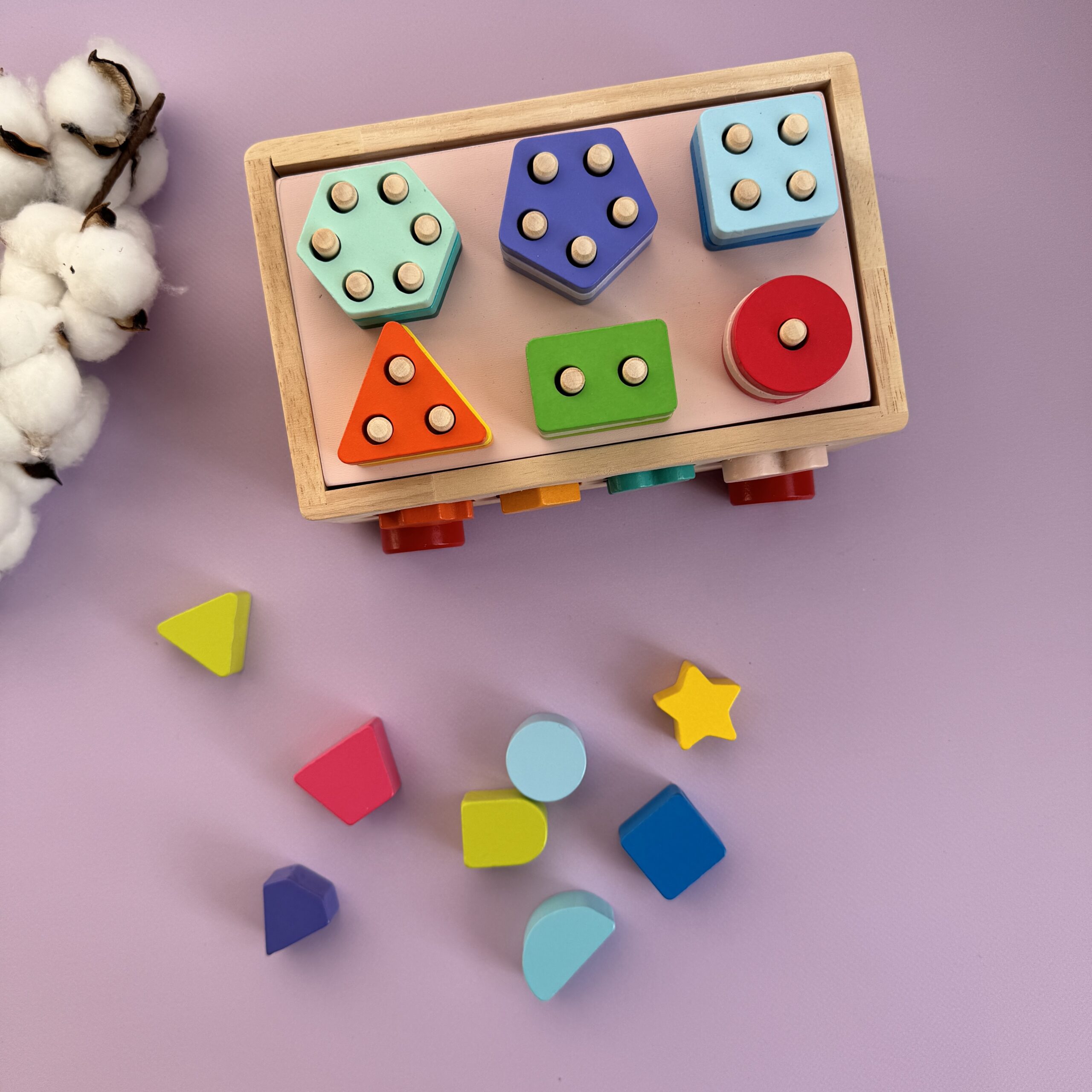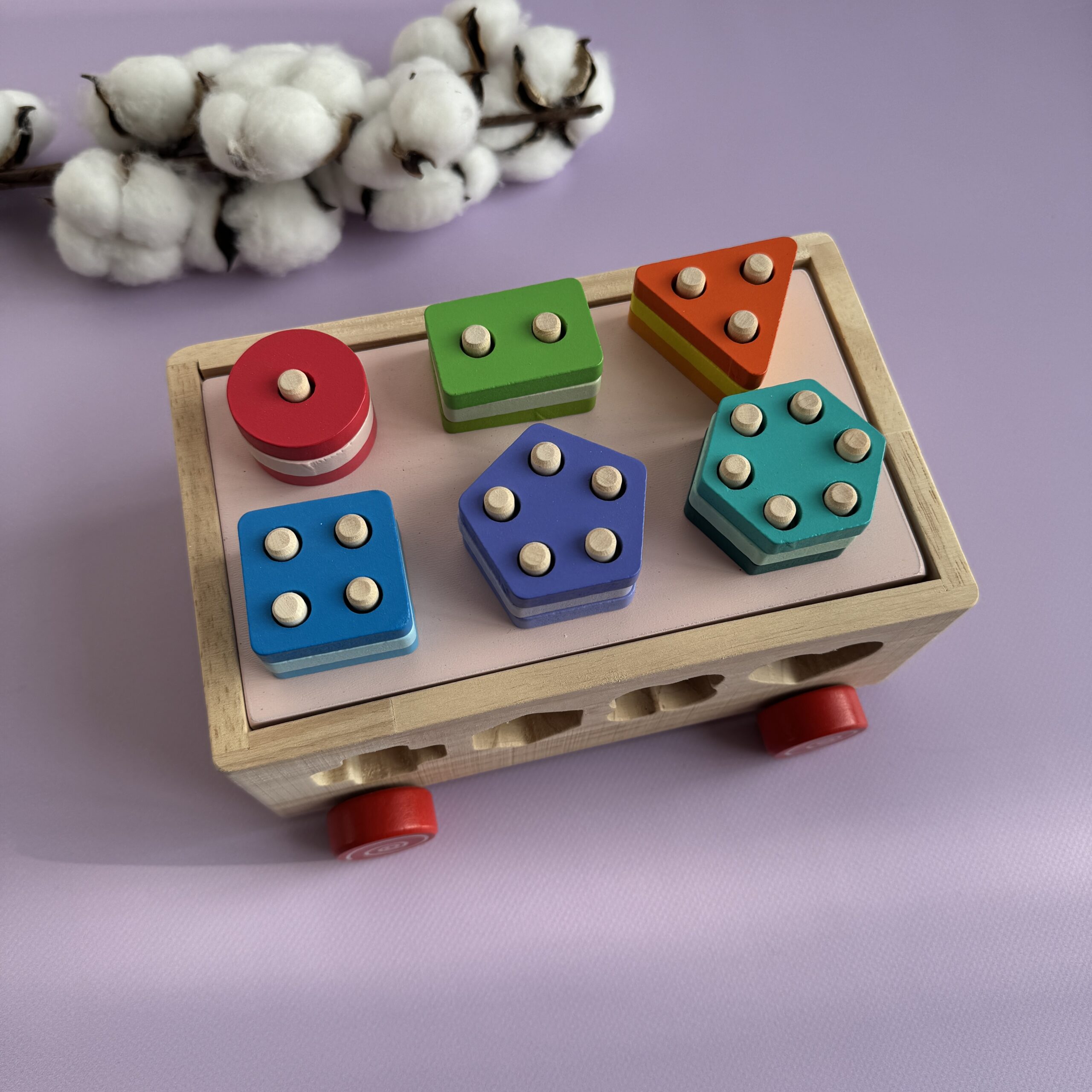 Багатофункціональна дерев’яна іграшка 3-в-1 з геометричними фігурами: сортер, тематична гра та каталка