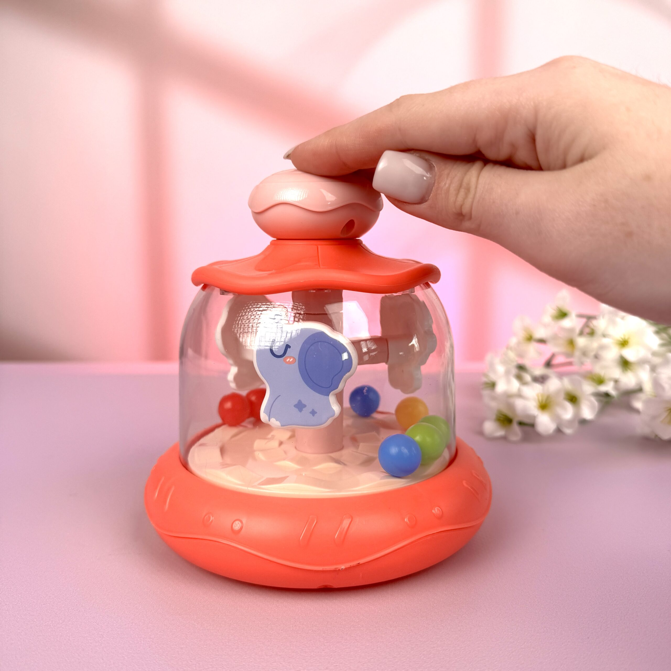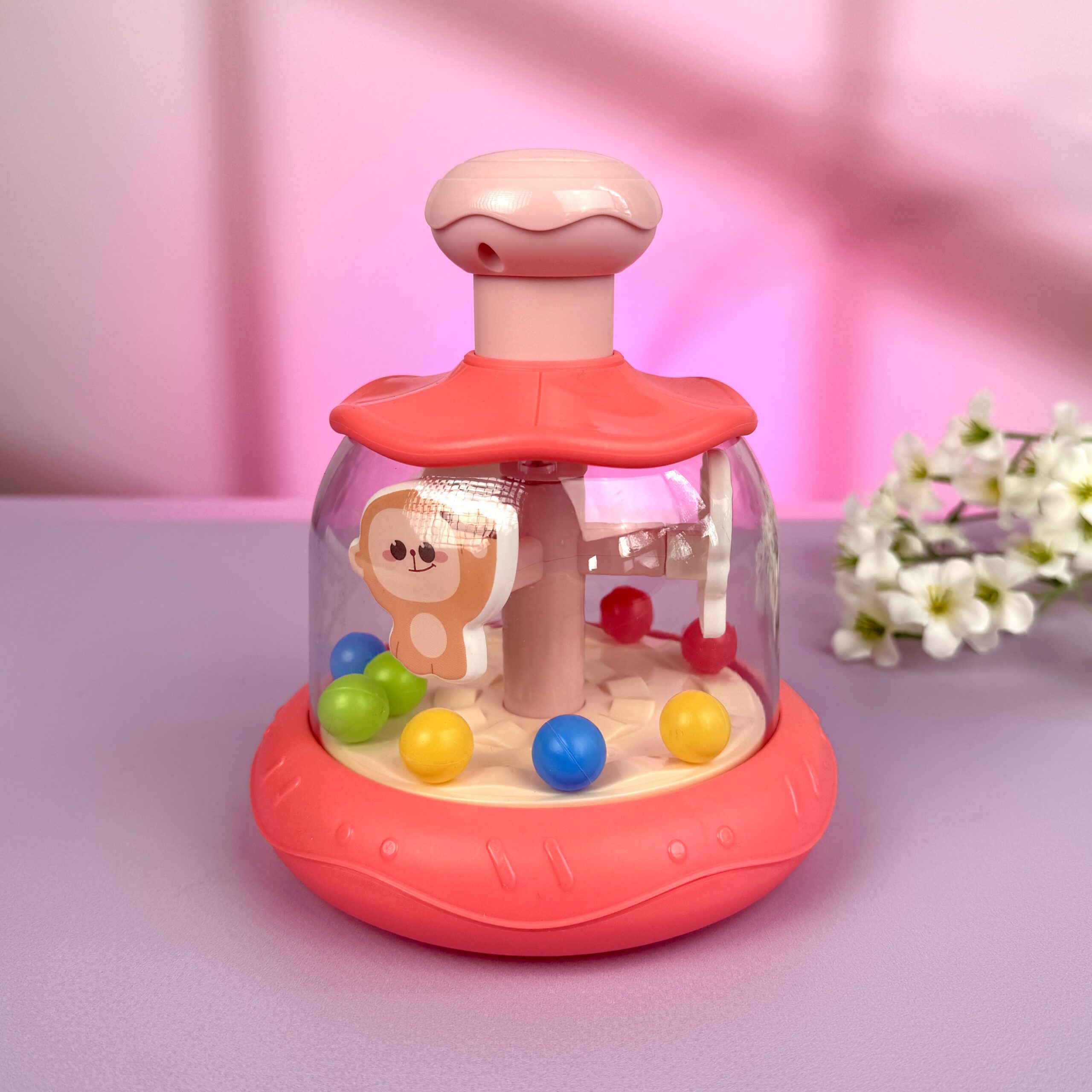 Щойно дитина натисне на верхівку дзиги, механізм активується — і вона почне весело крутитись, запрошуючи до гри. У цей час усередині закрученого куполу починають рухатися кольорові кульки, створюючи захопливу візуальну виставу, яка приковує увагу малюка. Така взаємодія тренує зорово-моторну координацію, стимулює дрібну моторику та сприяє розвитку причинно-наслідкових зв’язків.