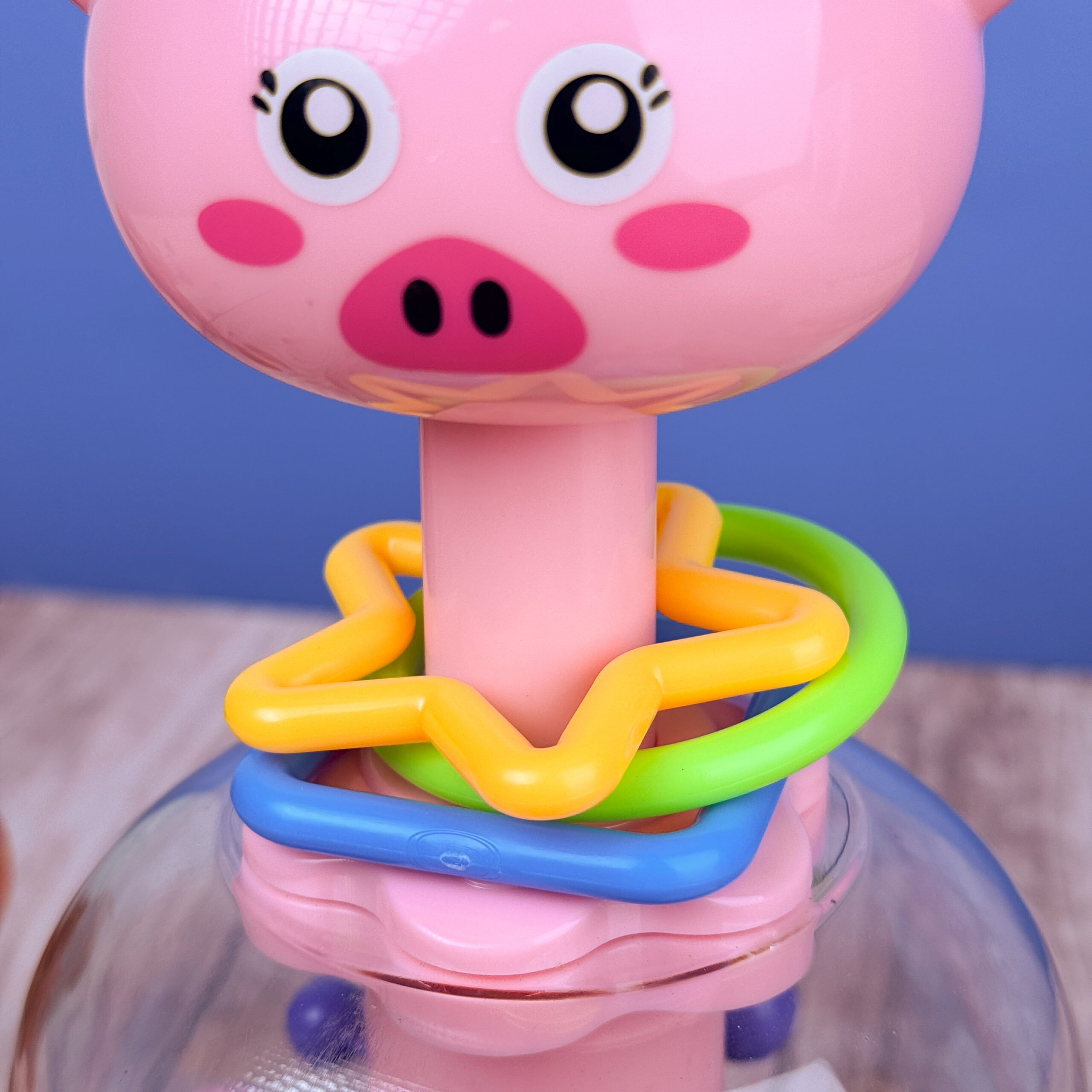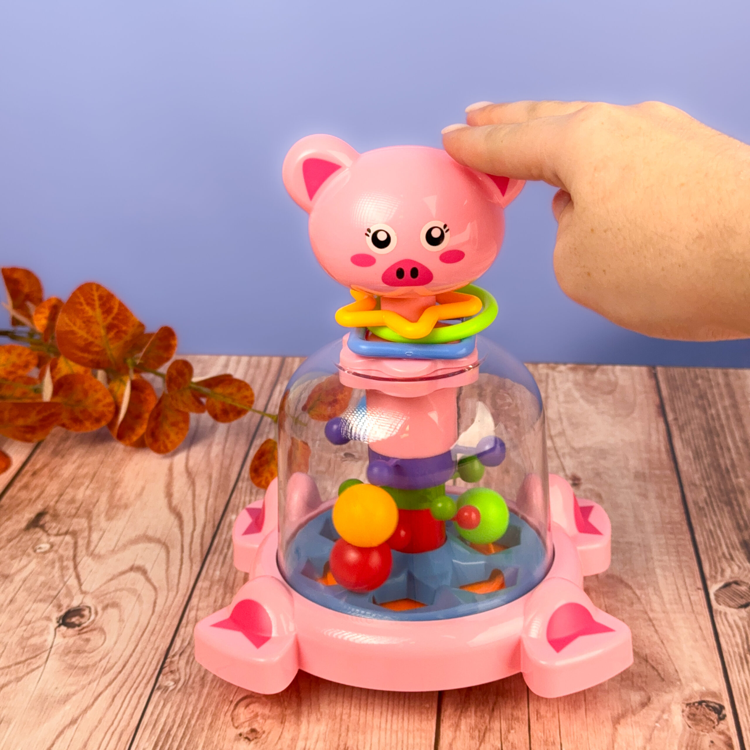 Якщо запустити дзигу, дитина побачить, як під пластиковим ковпаком на різних рівнях обертаються різнокольорові кульки. На шиї іграшки різнокольорові кільця, з якими малюк також може грати.