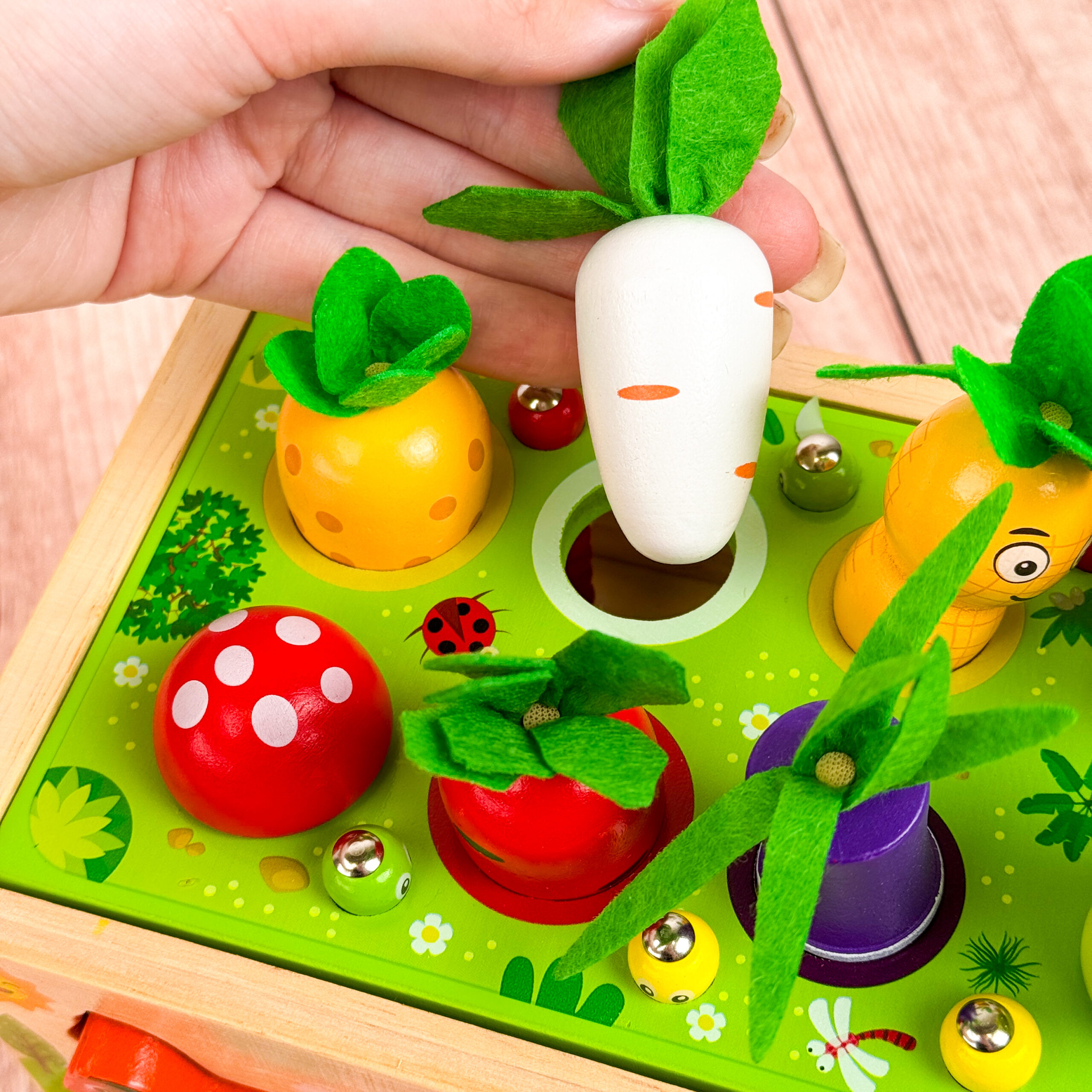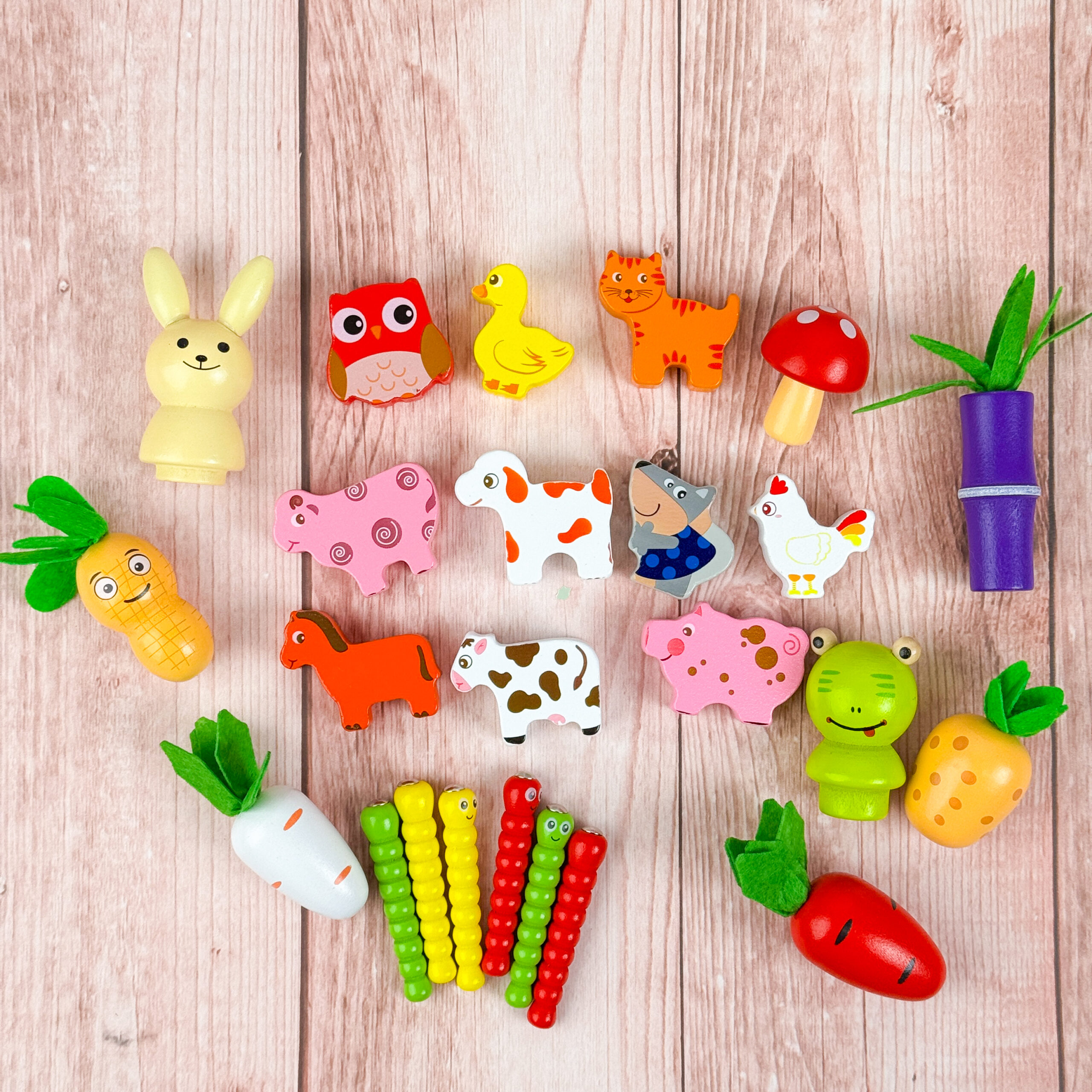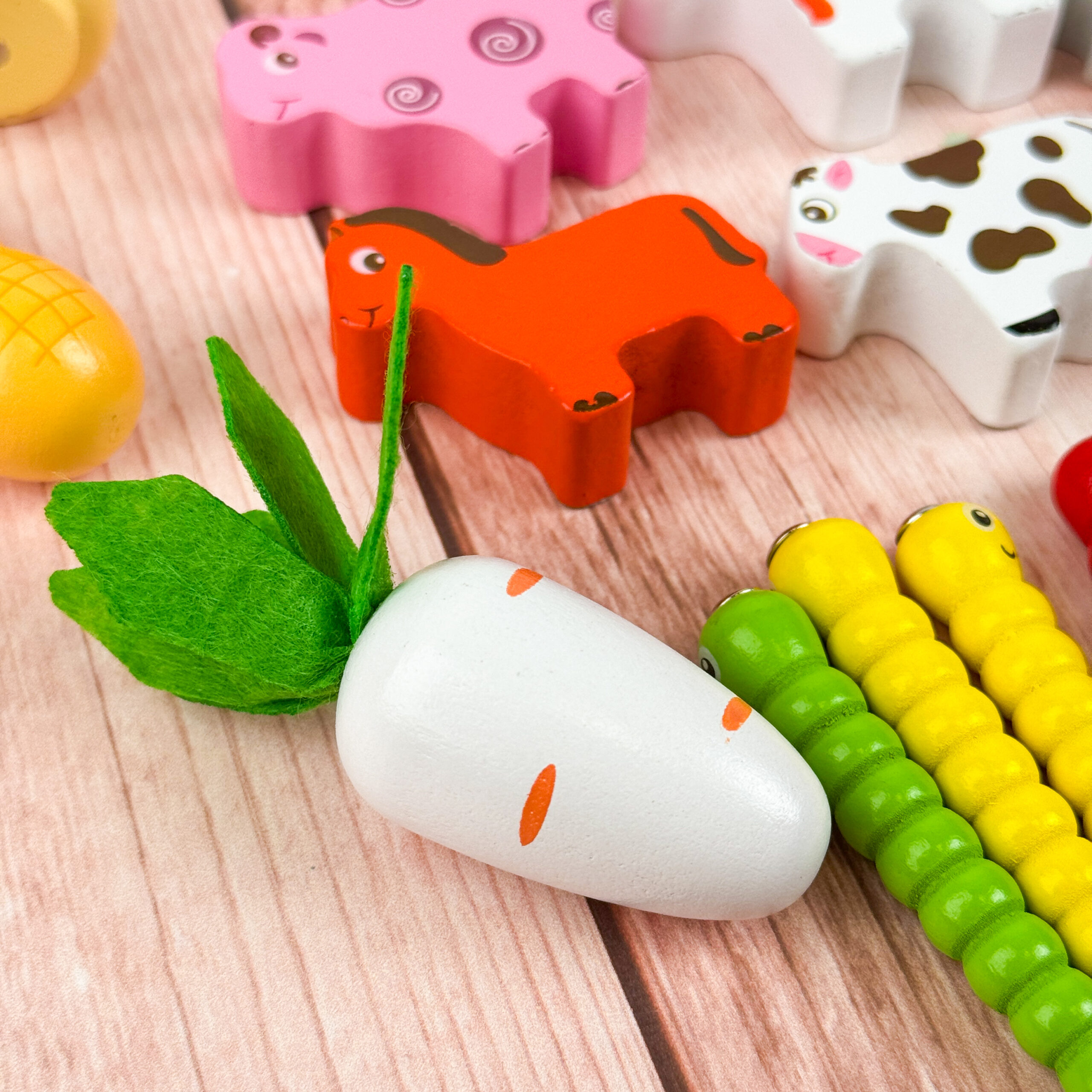 Яскрава дерев’яна іграшка у вигляді ферми з рухомими колесами, тваринами, овочами та веселими фігурками допомагає дитині пізнавати світ через гру. Малюк зможе сортувати фігурки за формою, впізнавати тварин, вивчати кольори та тренувати логіку, вставляючи деталі у відповідні отвори. Всі елементи виготовлені з безпечних екологічних матеріалів і покриті нетоксичними фарбами.