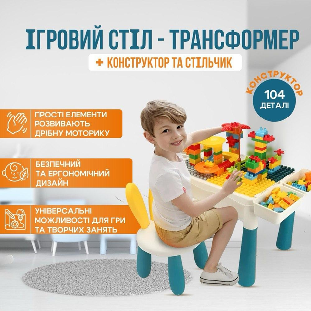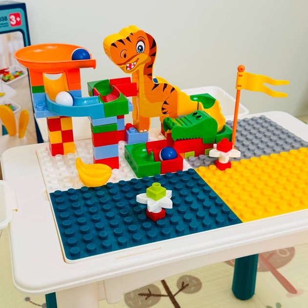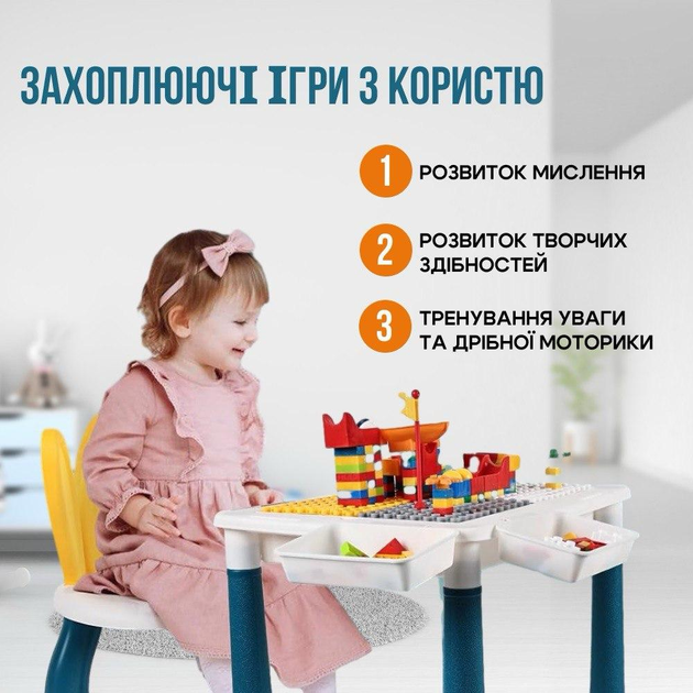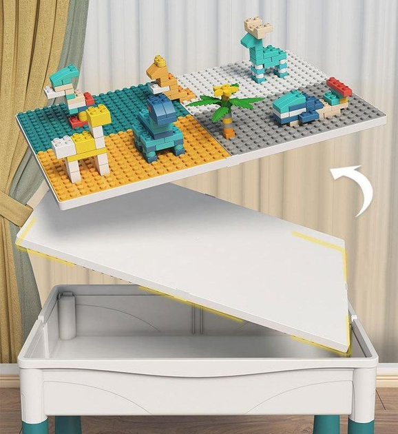 Багатофункціональний дитячий столик зі знімною двосторонньою стільницею та вбудованим конструктором. Ідеально підходить для ігор, навчання, малювання та обіду.