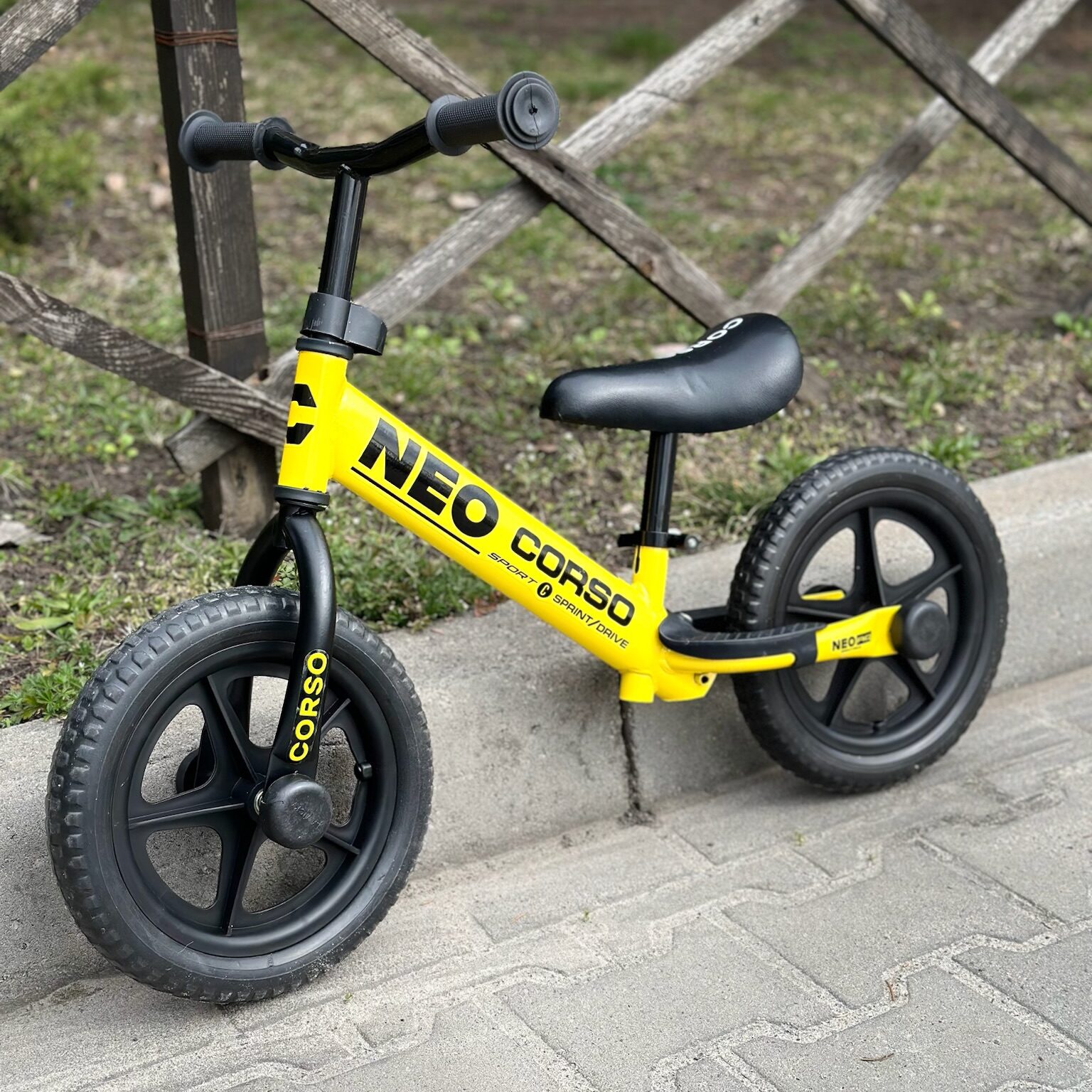 Дитячий велобіг CORSO NEO 12″ – 12-дюймові безкамерні колеса, сталева рама, зручна підставка, жовтий