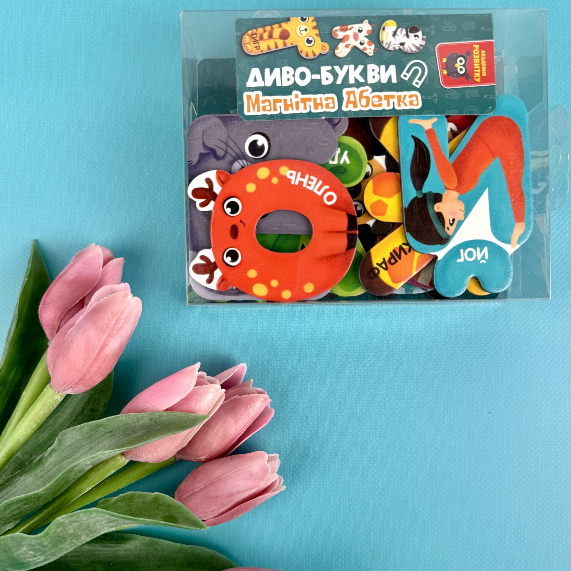 56 елементів гри та 8 карток із завданнями сприяють не лише запам’ятовуванню букв і слів, а й розвитку пам’яті, логіки, мовлення та дрібної моторики.
