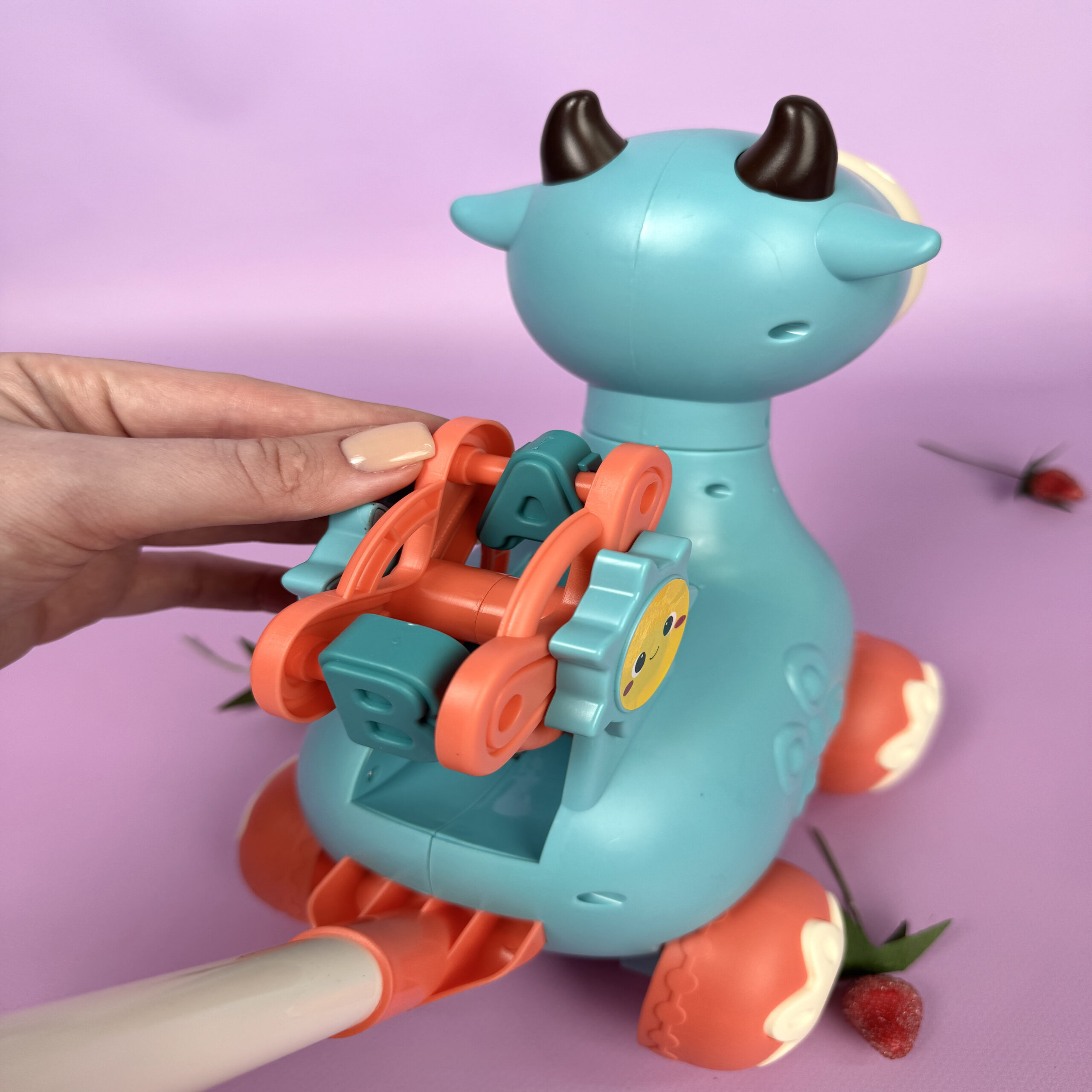 Кумедна Пані Корівка знає, як зробити прогулянку незабутньою! Вона не просто котиться разом із малюком, а ще й запускає мильні бульбашки, грає веселу мелодію та підсвічує коліщатка яскравими барвами. А на її спинці – млин із літерами, який обертається, коли іграшка в русі.