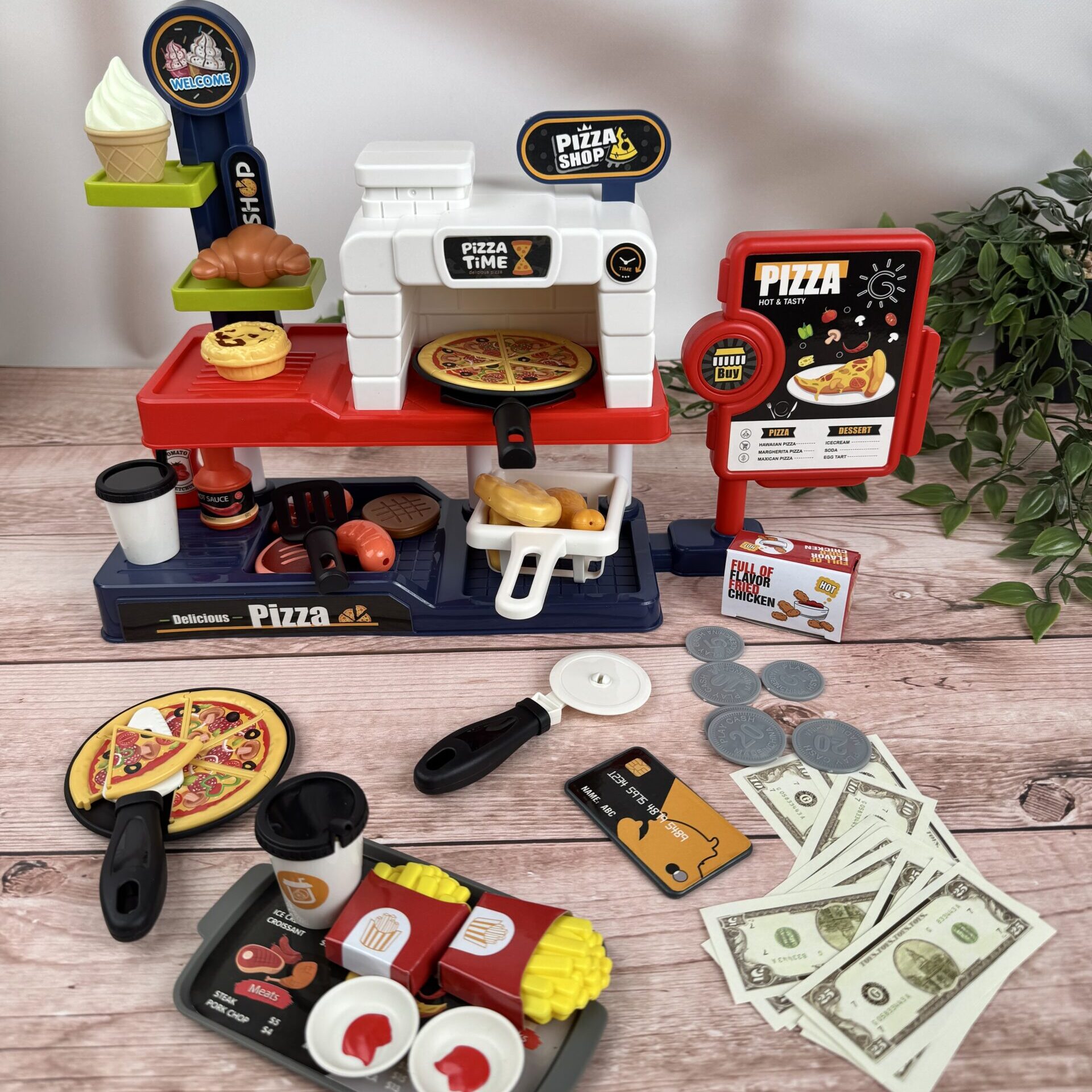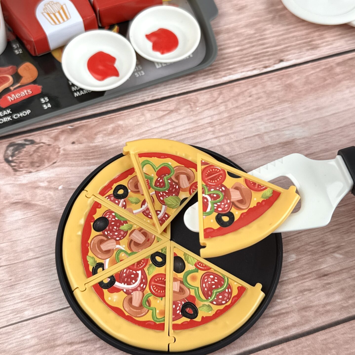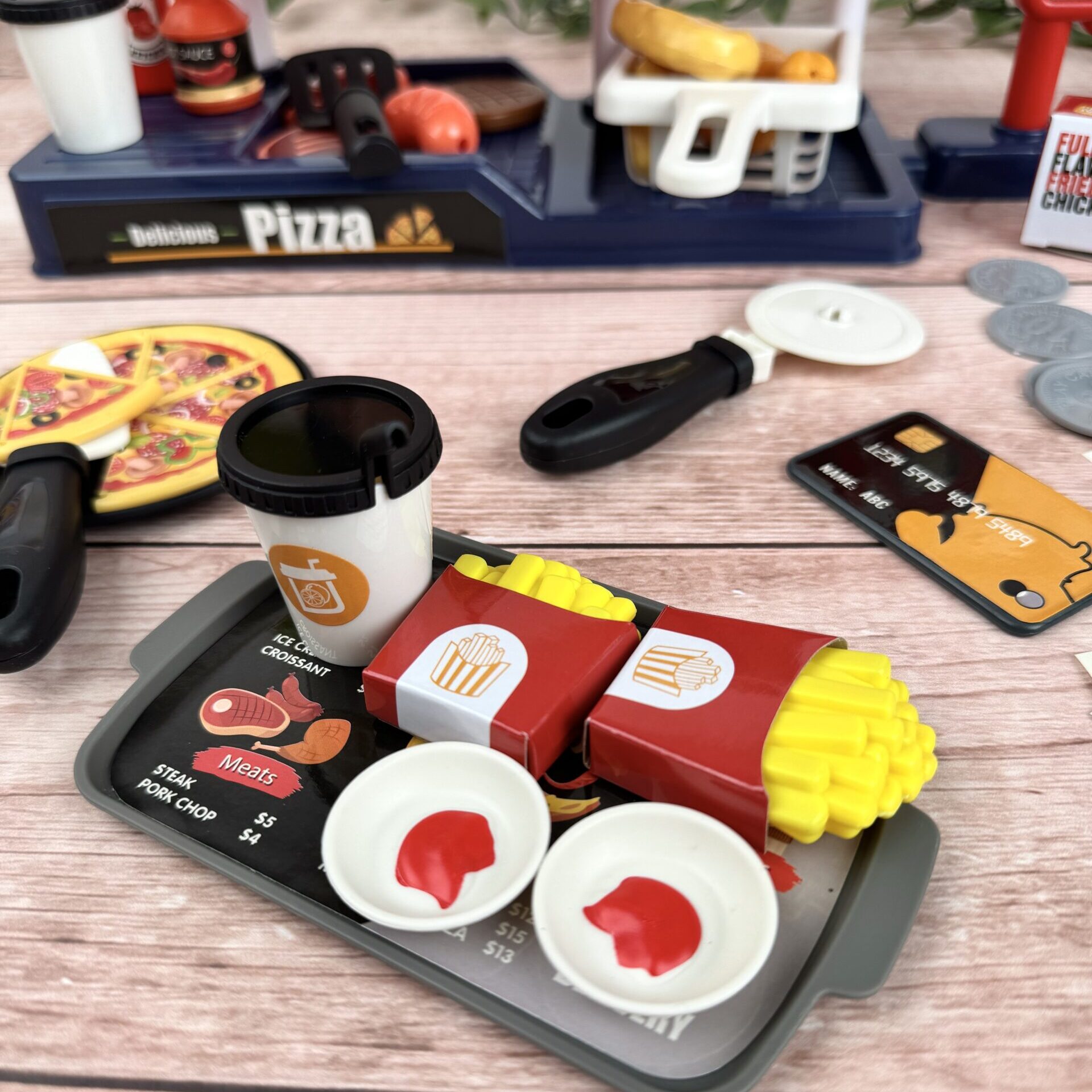 Хочеш смачну піцу, хрустку картоплю фрі або соковиту курочку гриль? Тепер це можливо в твоїй власній ігровій піцерії! 🎉 Оплачуй замовлення на касі самообслуговування зі справжніми звуками 🛒 і відчуй себе справжнім шеф-кухарем! 👩🍳👨🍳