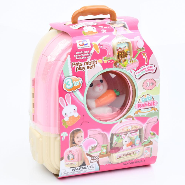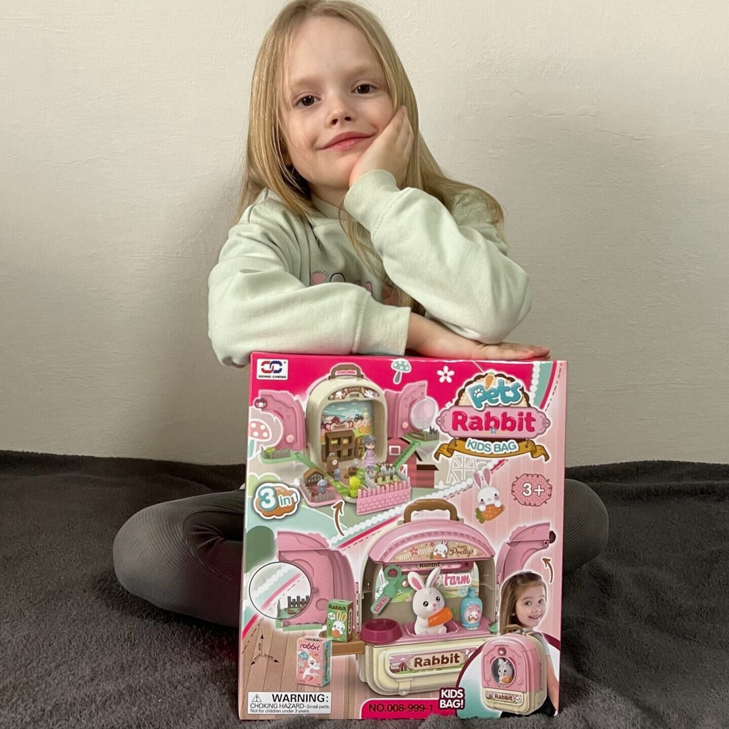 Цей унікальний набір легко трансформується з компактного рюкзака в цілу ферму з городом, садом та будиночками для собак і котів. А головна зірка — великий кролик, якого можна годувати, купати, зачісувати і навіть стригти!