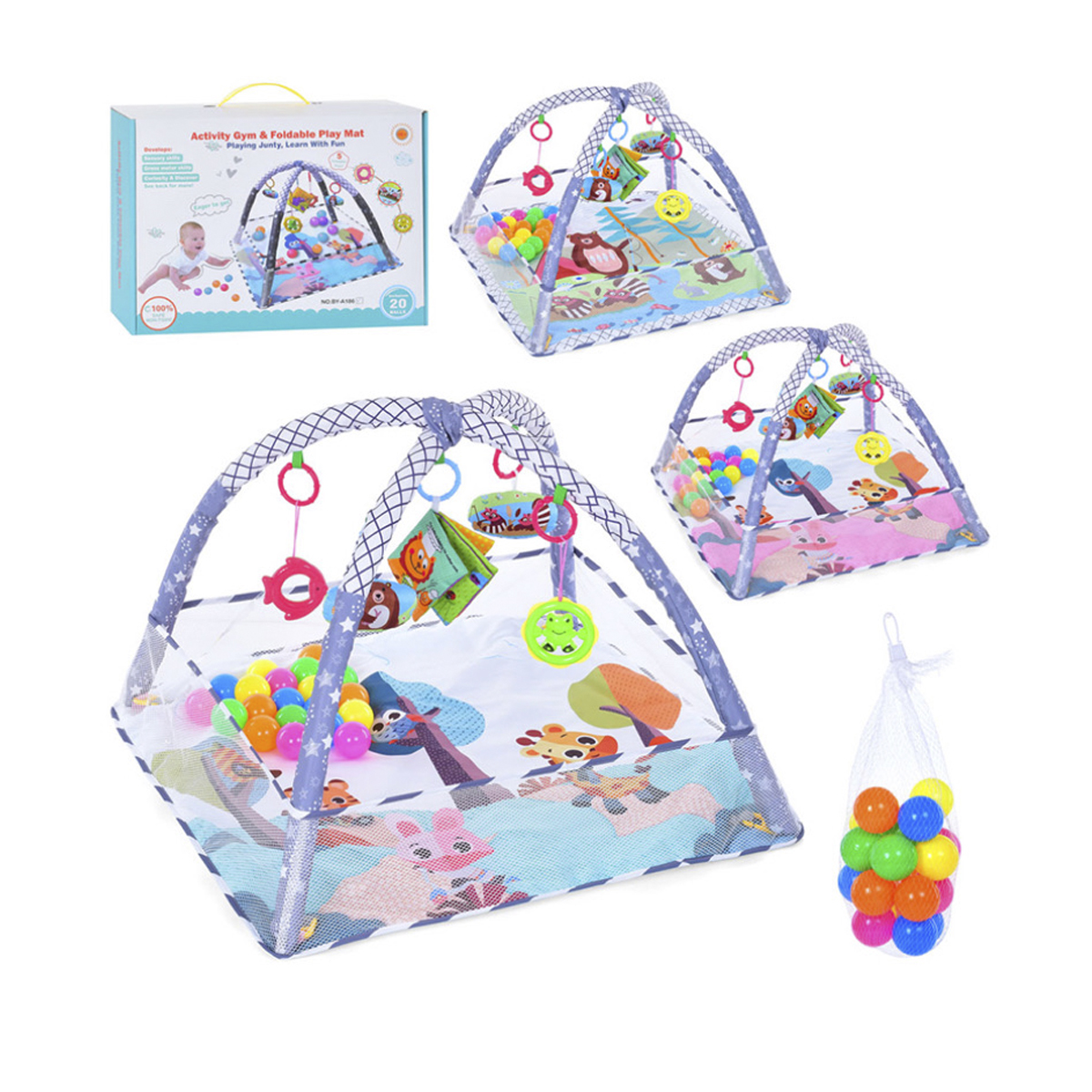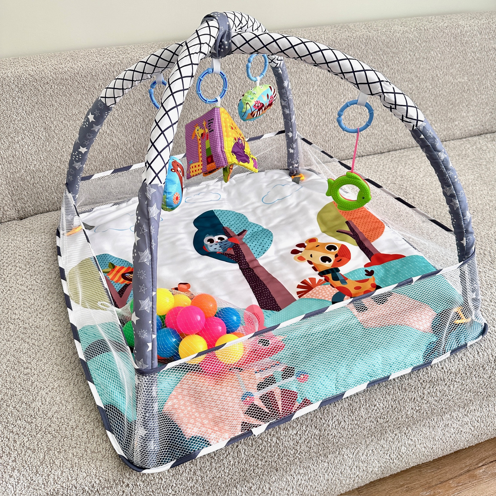• Іграшки та 20 кольорових кульок: стимулюють увагу, координацію та моторику