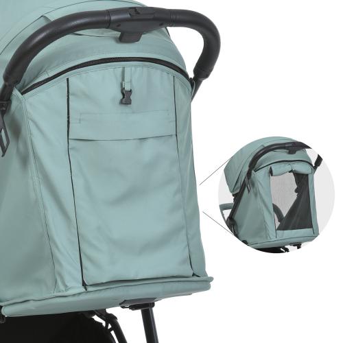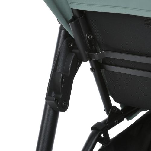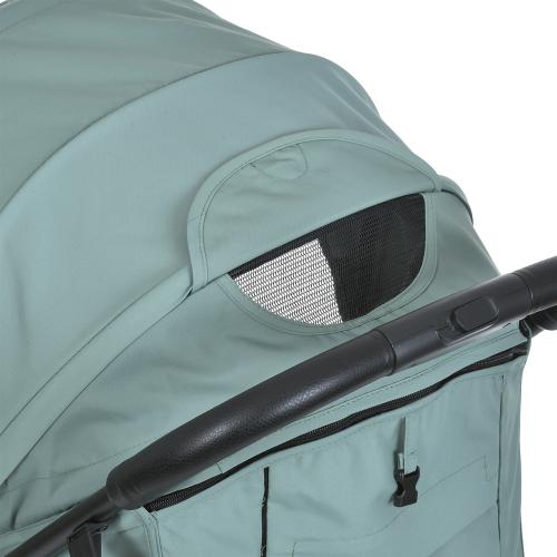 Рама виготовлена зі сталі, а ручка з оббивкою з екошкіри розташована на зручній висоті — 100 см. Тканина коляски має водовідштовхувальне та UV-захисне покриття.