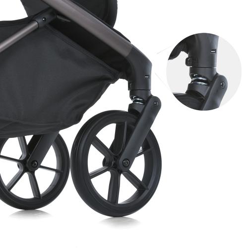 Поліуретанові колеса з амортизацією, встановлені на підшипниках, забезпечують м’який хід навіть на нерівній поверхні. Колеса легко знімаються для догляду. Регульована по висоті ручка з екошкіри (від 104 до 119 см) адаптується під зріст батьків. У комплекті – теплий чохол на ніжки та знімна м’яка подушка для додаткового комфорту.