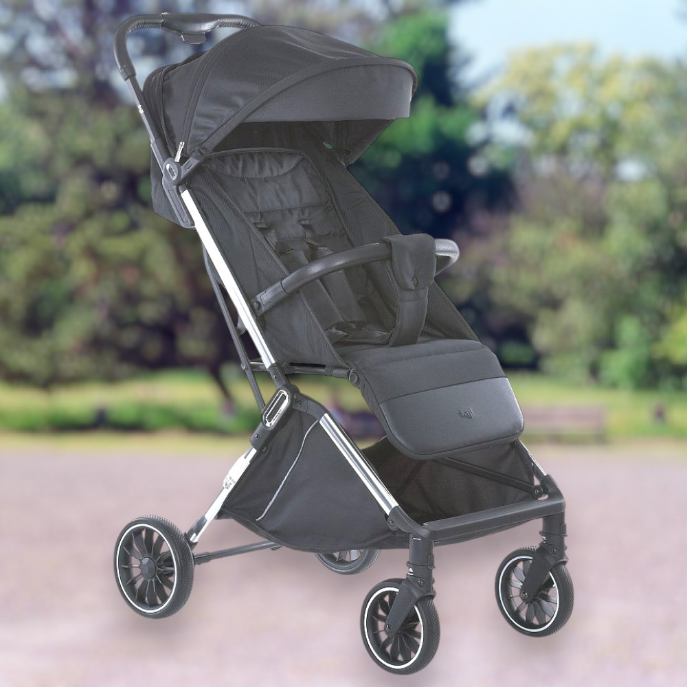 Каркас із алюмінію та сталі не лише виглядає стильно, а й майже невагомий. Коляска автоматично складається до компактного формату — її зручно носити й зберігати. Нижній кошик — збільшений, на магніті, витримує до 3 кг і підійде для покупок чи дитячих речей.