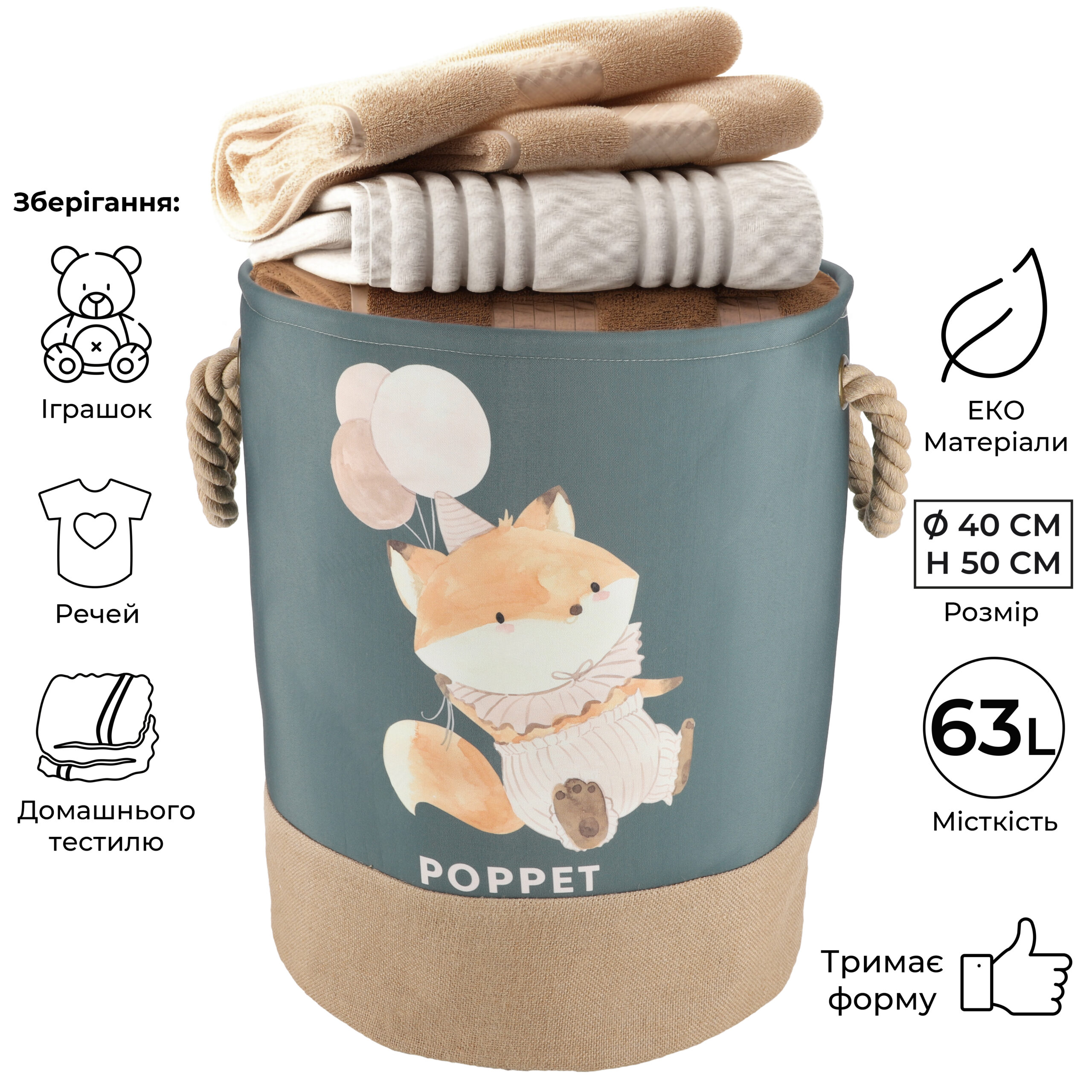 – Місткість: діаметр 40 см, висота 50 см, об’єм 63 літри — достатньо місця для зберігання іграшок та дитячих речей.