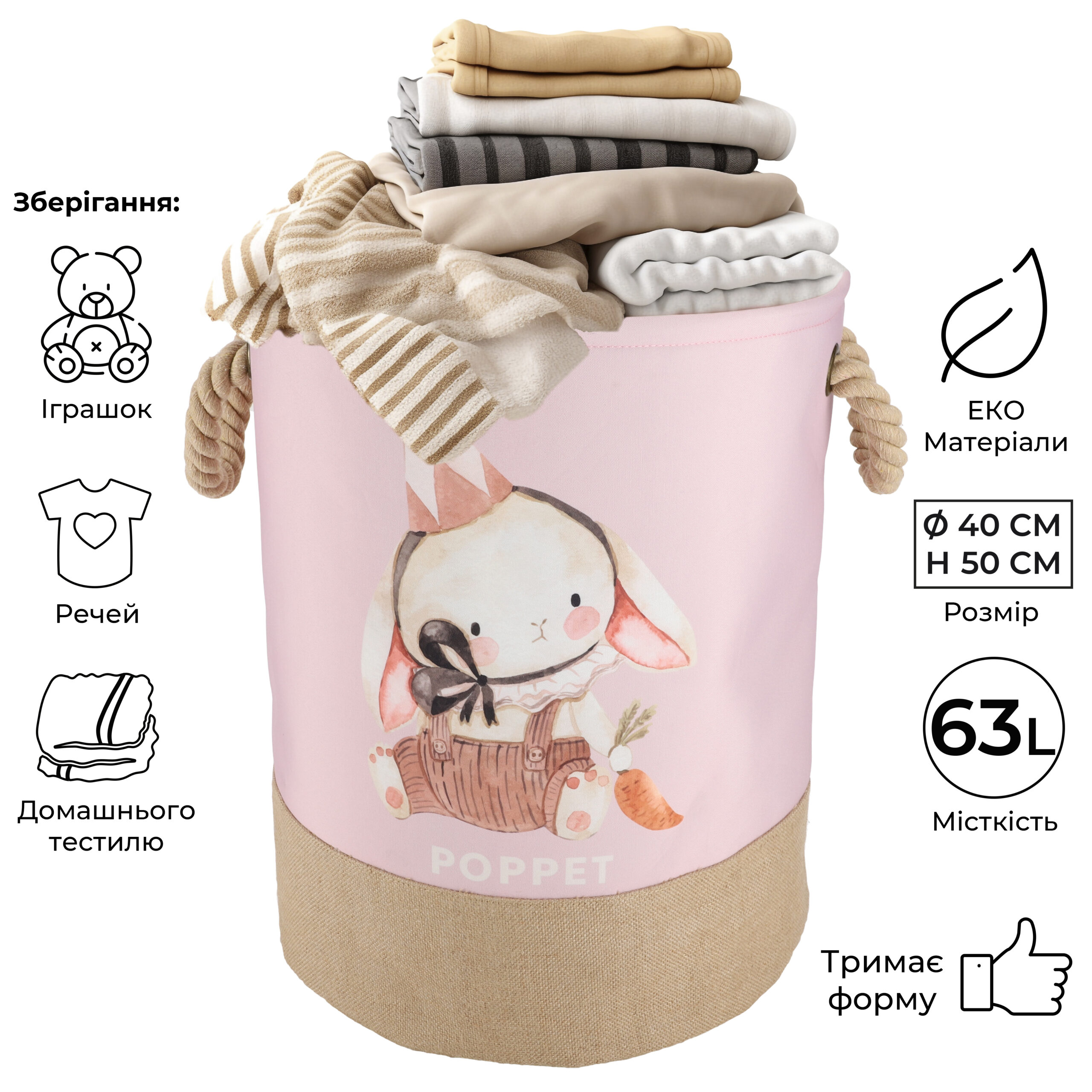 – Місткість: діаметр 40 см, висота 50 см, об’єм 63 літри — достатньо місця для зберігання іграшок та дитячих речей.