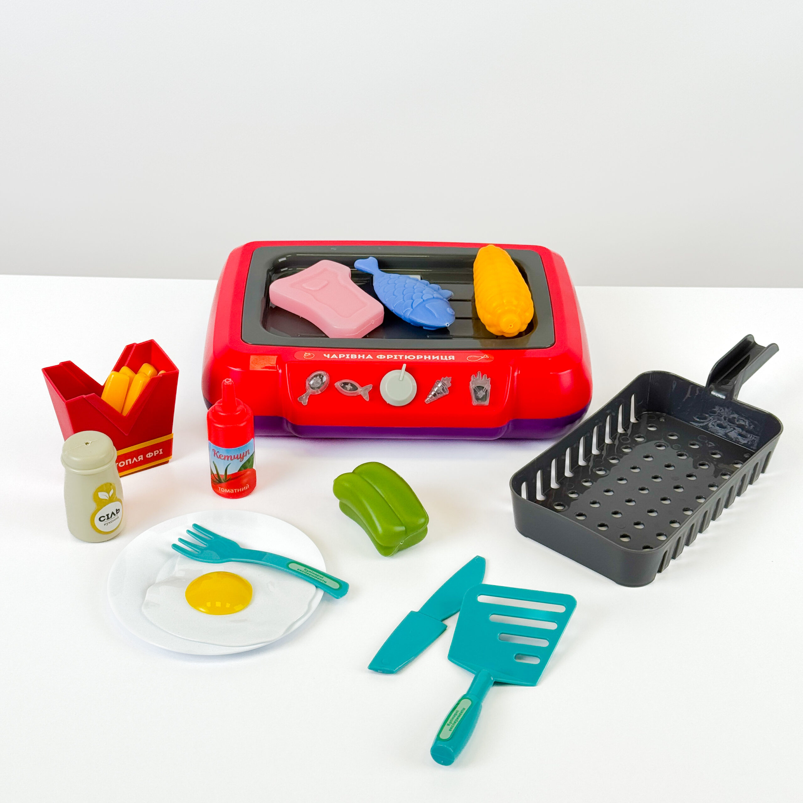 • 13 аксесуарів: фритюрниця, гриль, тарілка, сільничка, кетчуп, овочі, риба, м’ясо, яйце, картопля фрі, кухонні прилади;