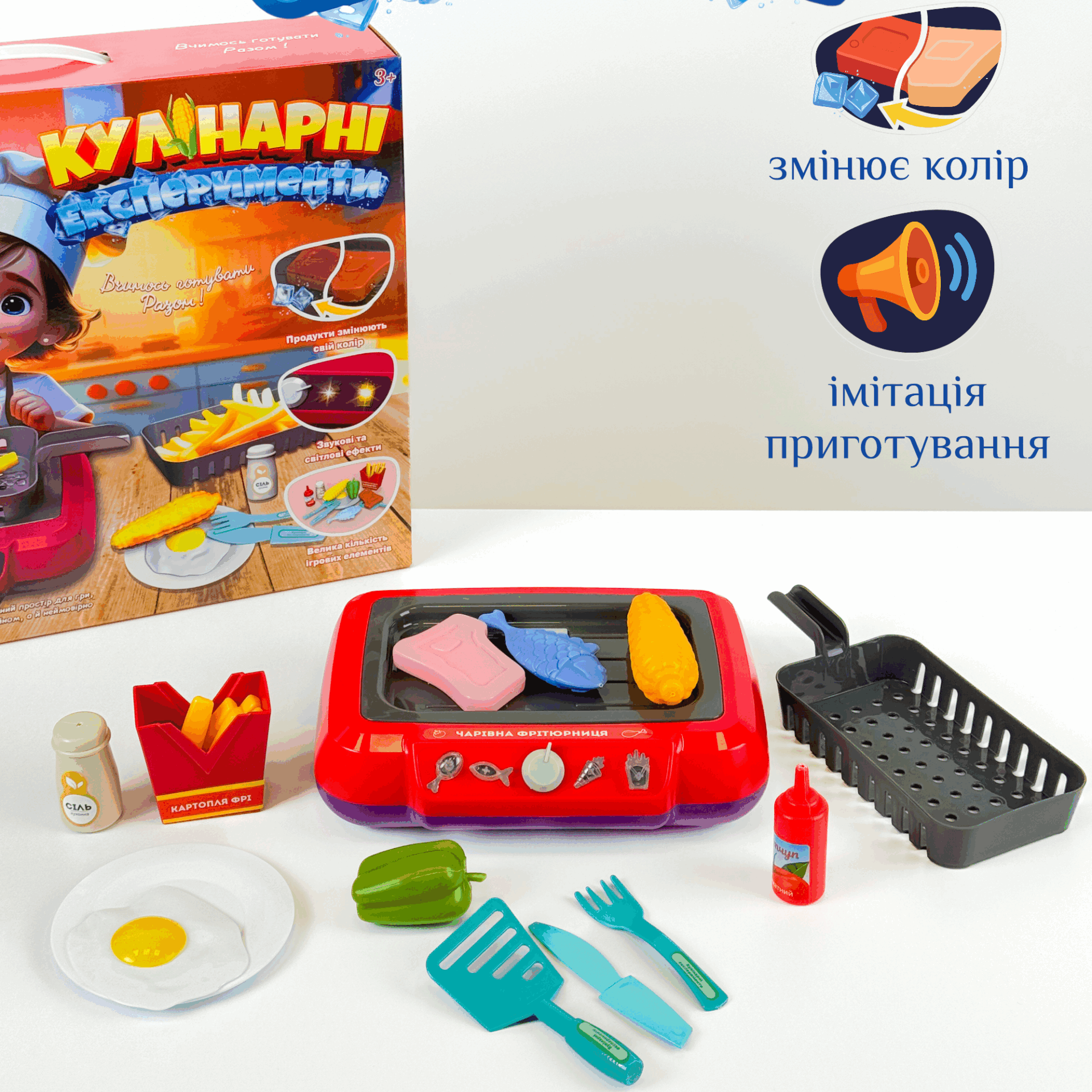 Дитяча кухня набір фритюрниця «Кулінарні експерименти» Подаруйте дитині справжню кухонну пригоду! Ця інтерактивна іграшка відкриває безмежний простір для творчих кулінарних ігор. Реалістичний дизайн у поєднанні з ефектним підсвічуванням, звуками та інтерактивними елементами створює відчуття, ніби дитина готує «по-справжньому».