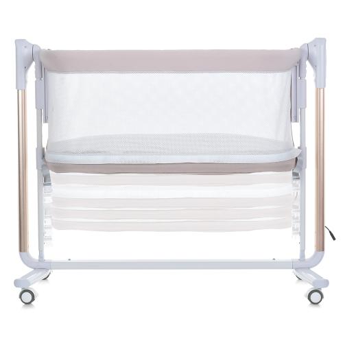 Бічна стінка легко опускається, що дозволяє пристосувати ліжечко до батьківського ліжка, а 7 рівнів висоти забезпечують універсальність для будь-якого інтер’єру. Вбудована система заколисування має 5 швидкостей гойдання, таймер (на 8, 15 або 30 хвилин) та 12 мелодій з регулюванням гучності, включаючи можливість підключення музики через Bluetooth. Керуйте функціями зручного заколисуючого блоку за допомогою панелі або пульта.