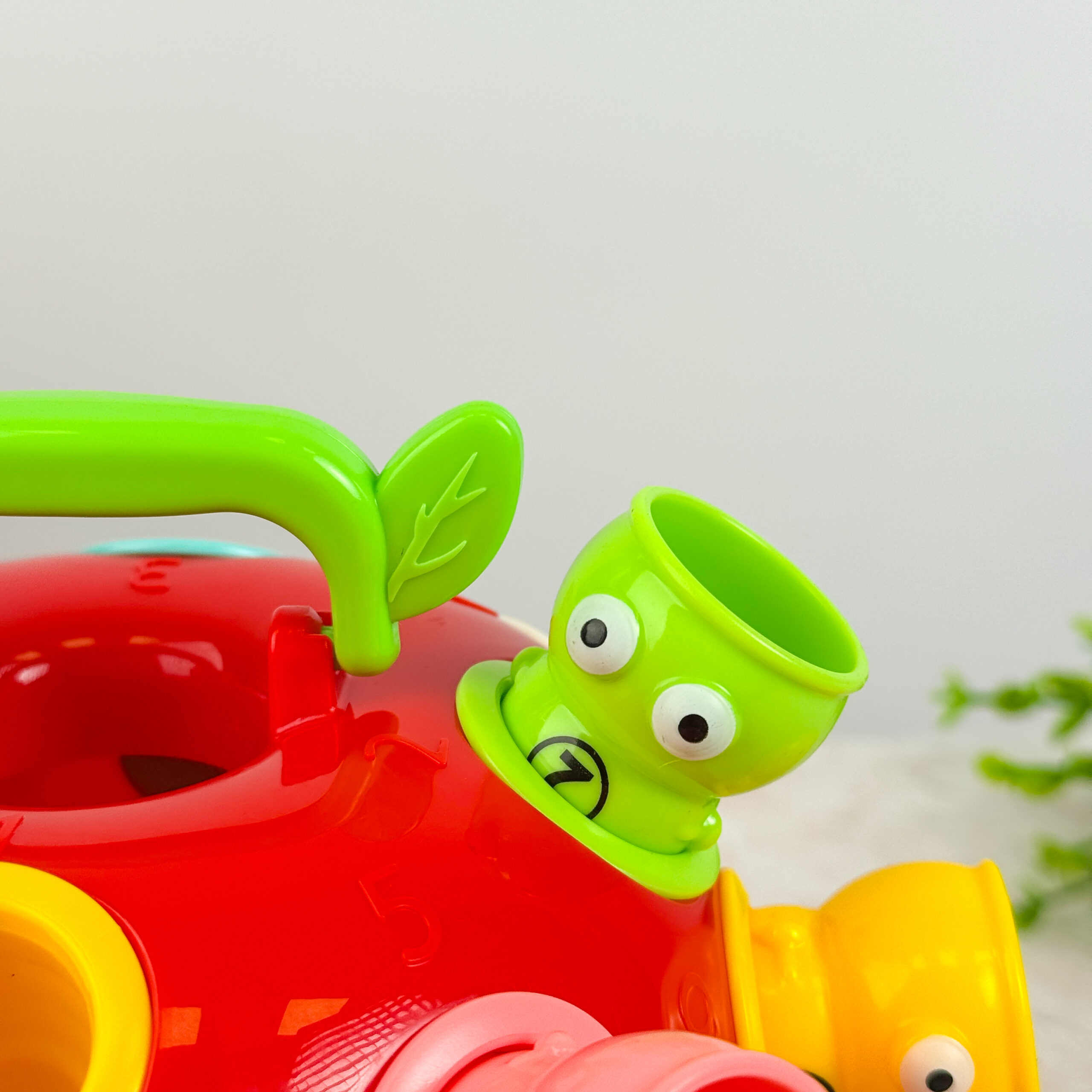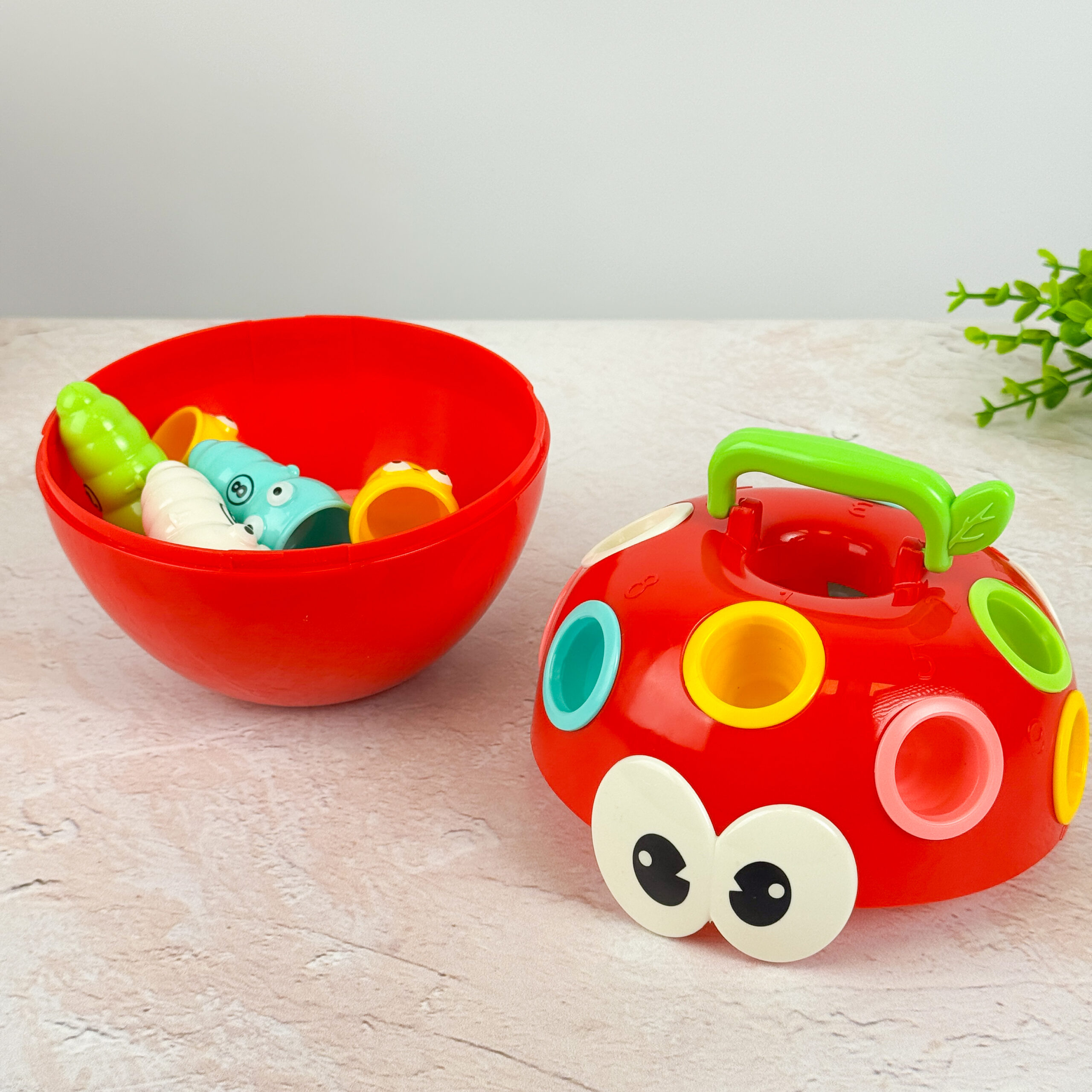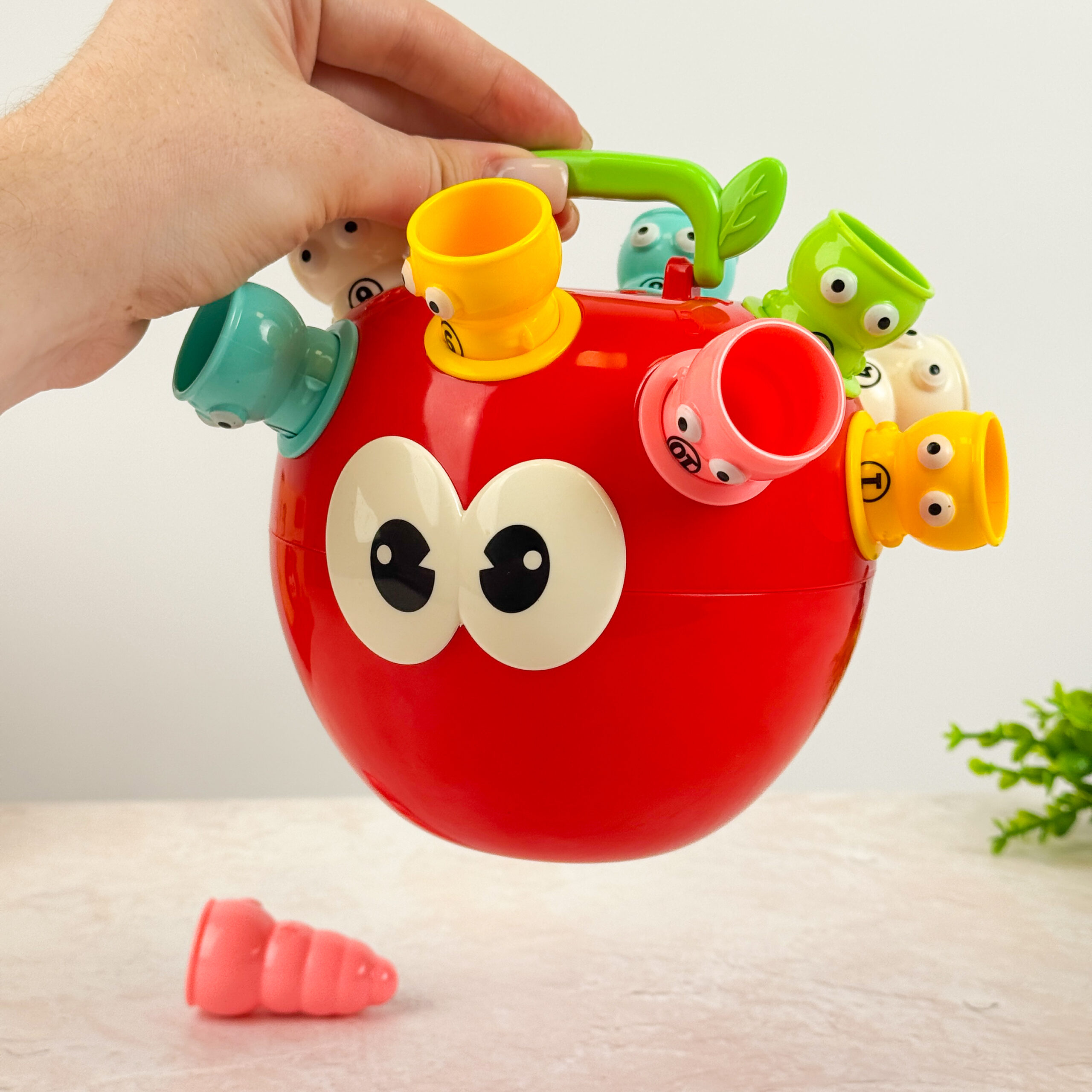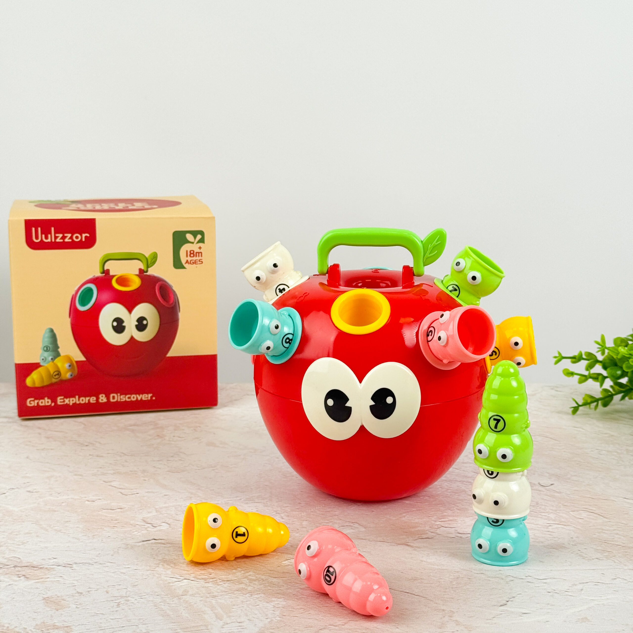 - Іграшка виконана у вигляді червоного яблука з 10 отворами, кожен з яких має окремий колір і позначений цифрою;