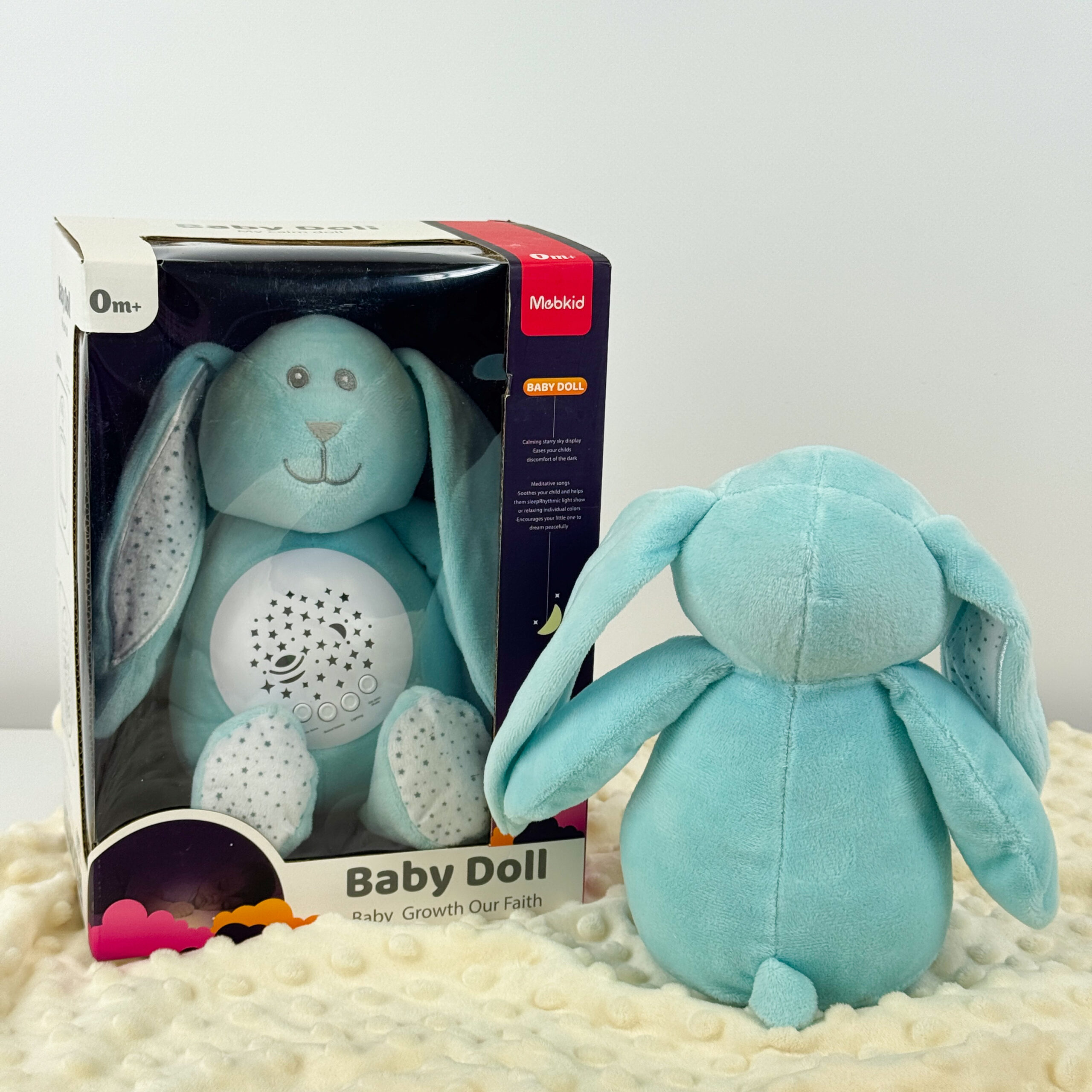 Мʼяка іграшка дитячий нічник з проектором Зайчик в коробці з мелодіями