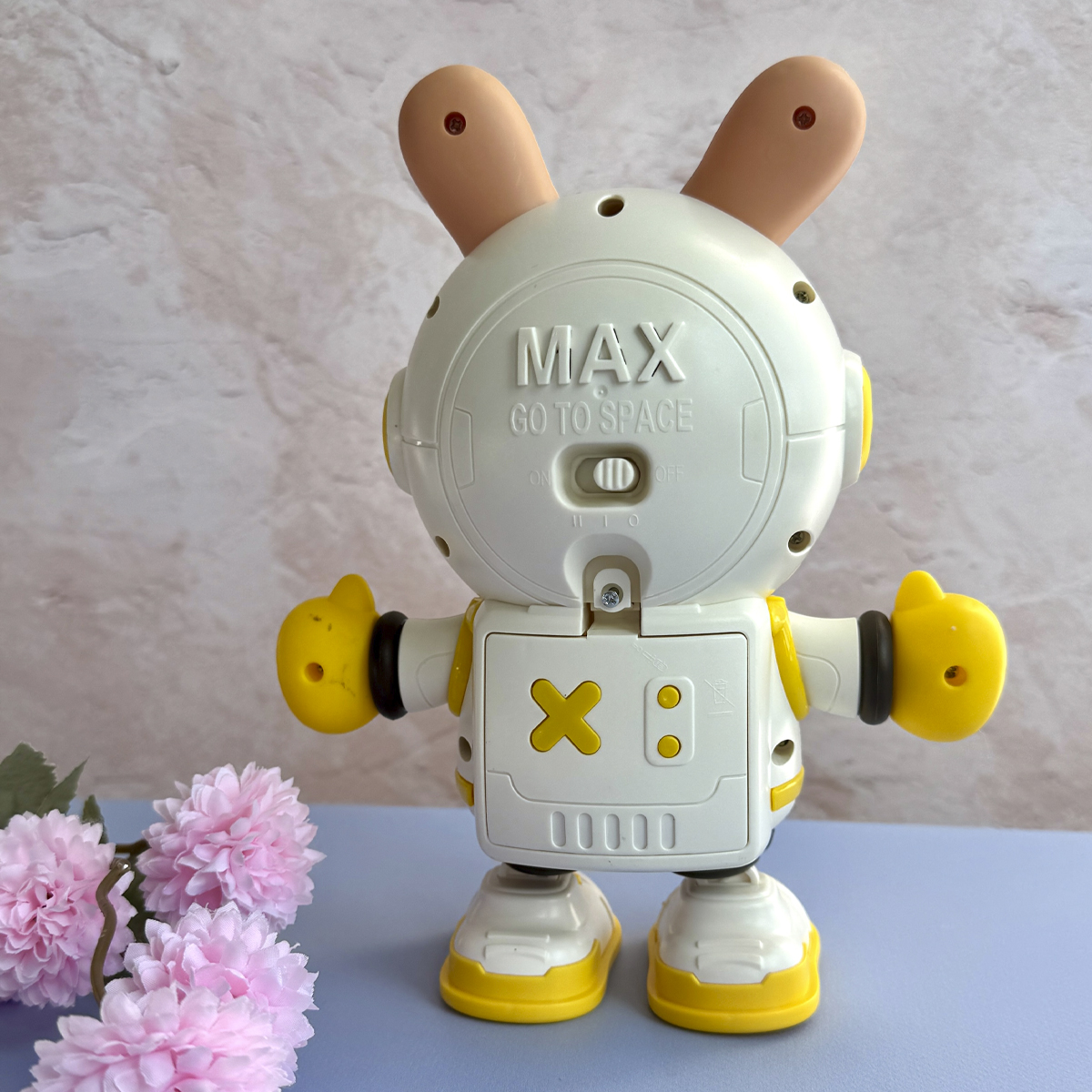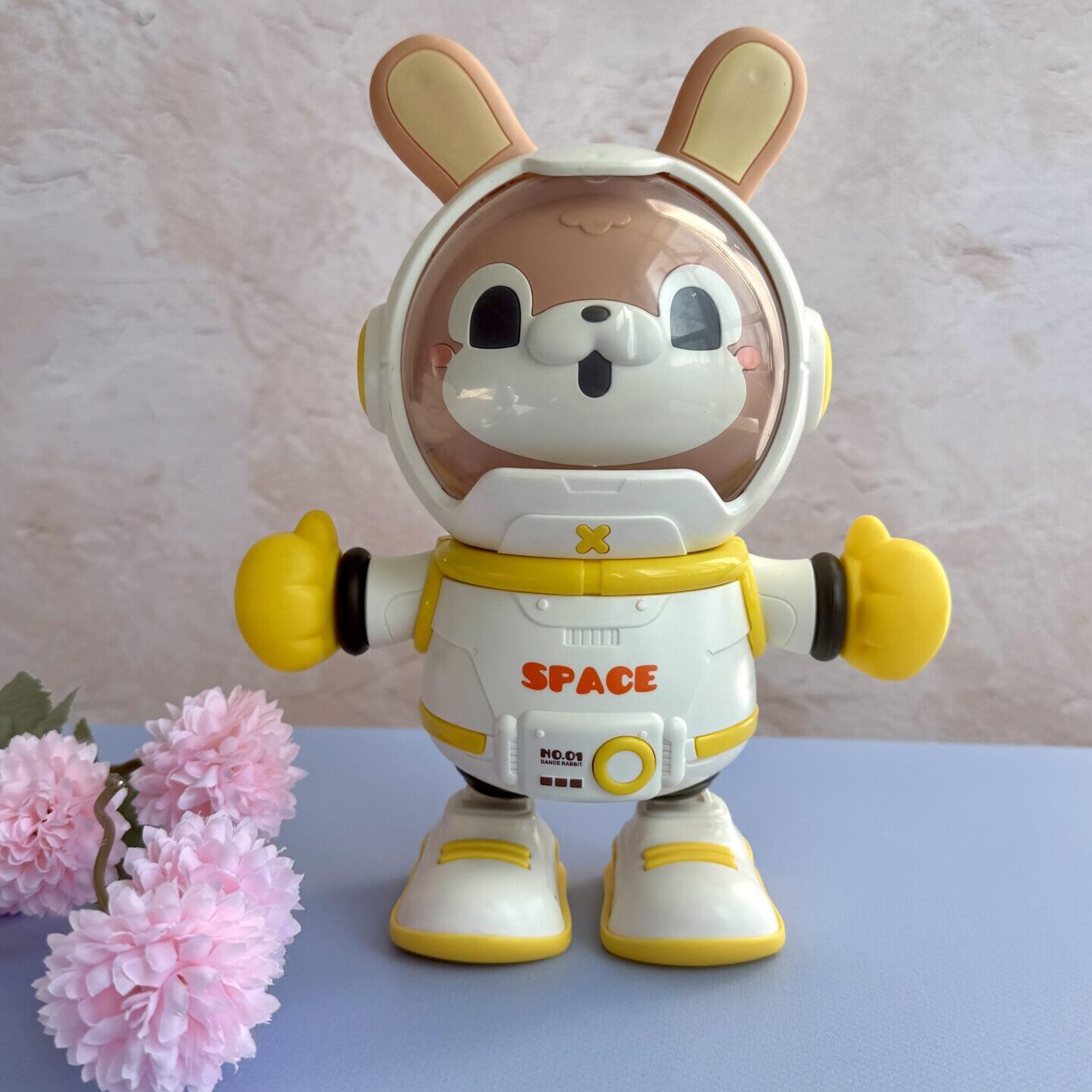 Ця яскрава іграшка у вигляді зайчика-астронавта подарує малечі море радості та веселощів! Як тільки натиснути кнопку, кролик починає танцювати, рухати кінцівками, обертатися, підсвічуватися яскравими кольорами та співати веселі пісні англійською мовою.