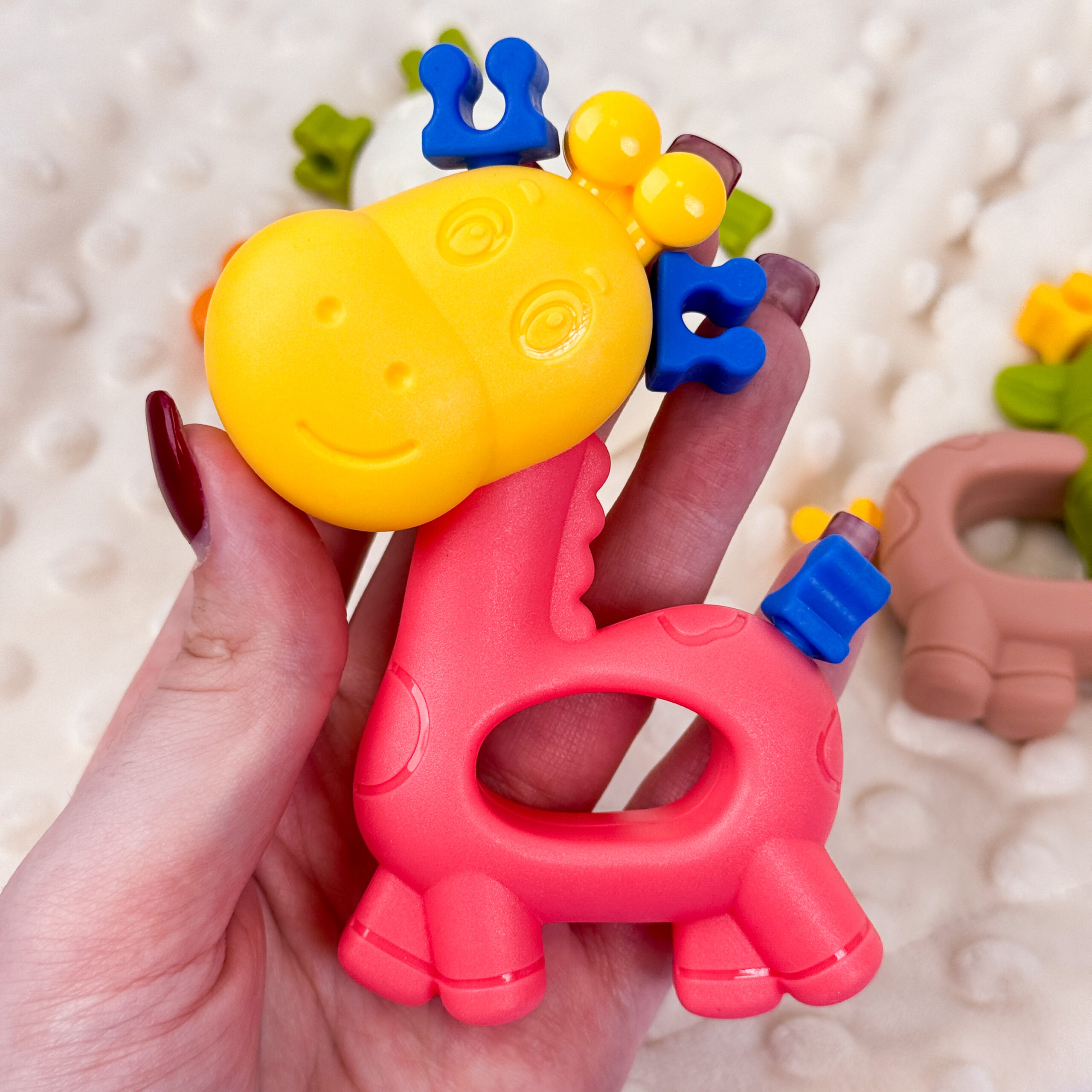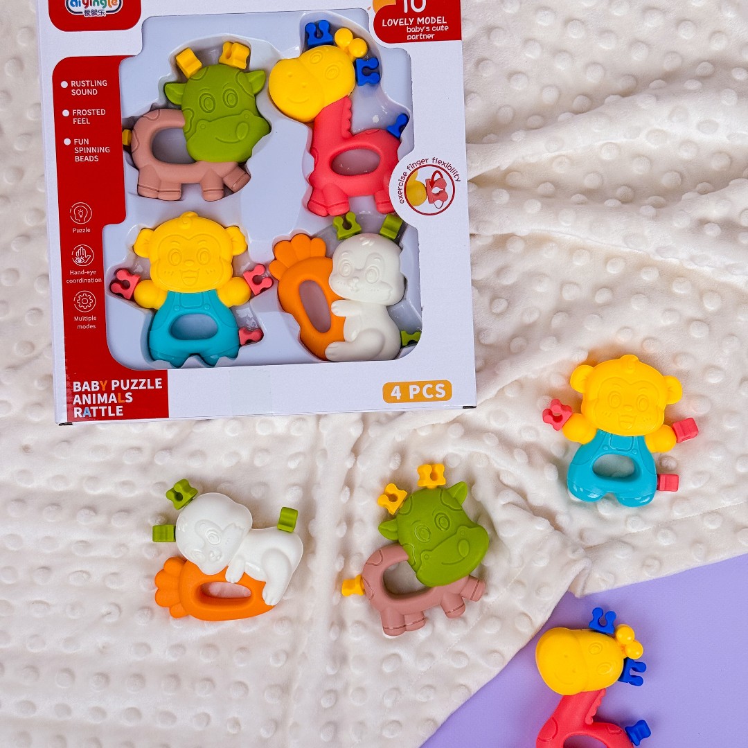 - ✅ 4 різнокольорові брязкальця у формі тваринок: корівка, жираф, мавпочка та песик.