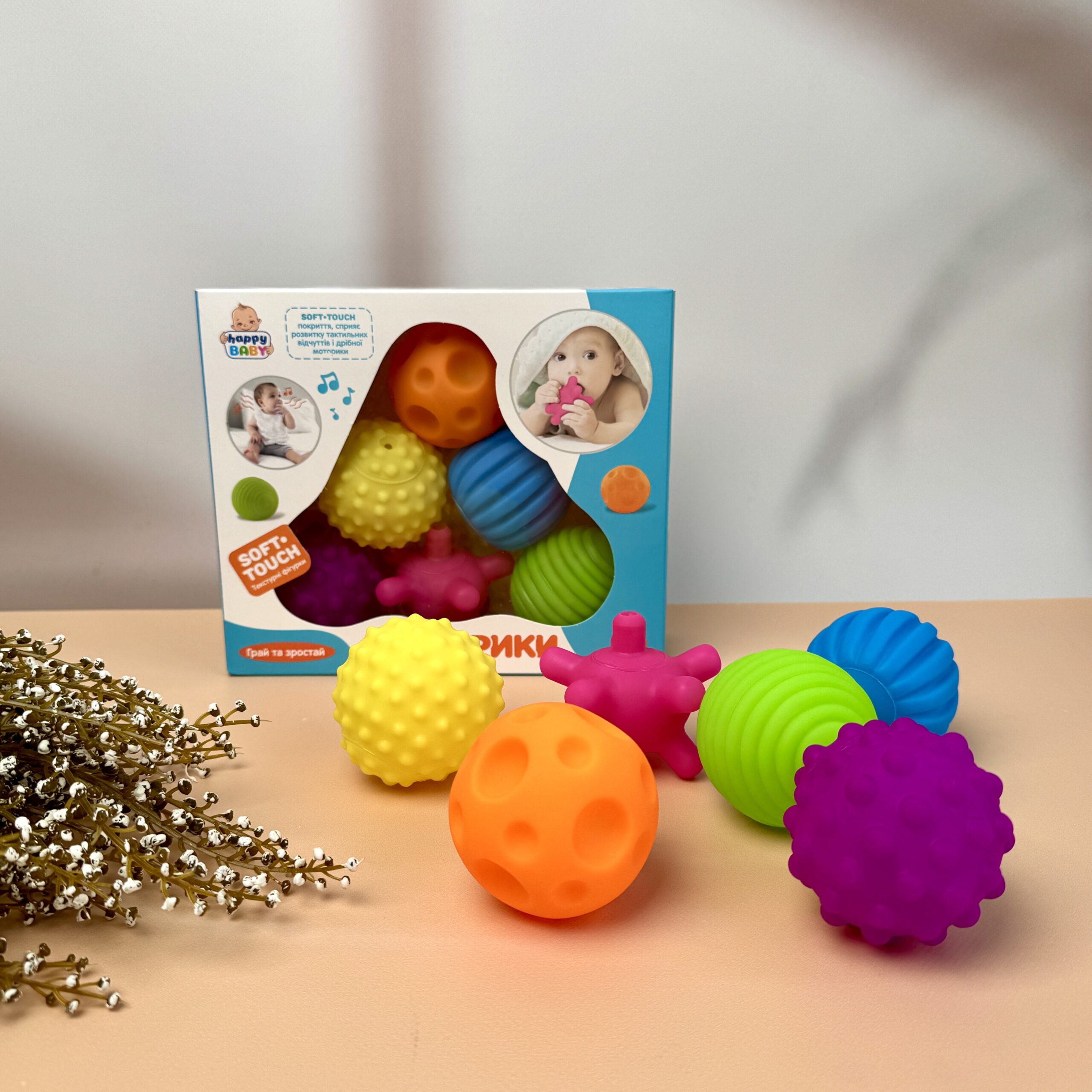 Сенсорні м’які кульки – набір із 6 розвивальних струтурованих мʼячиків для малюків