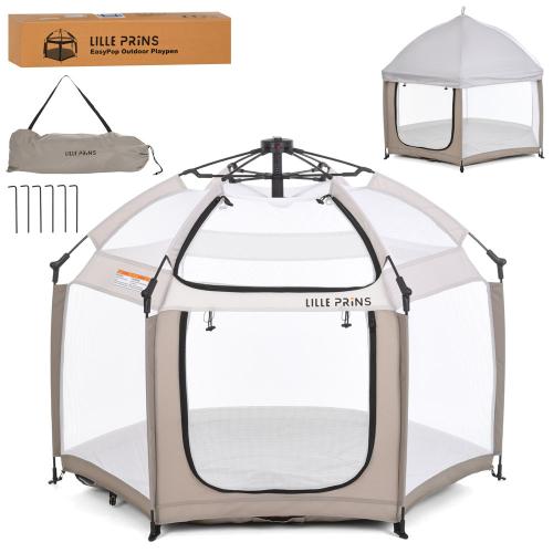 Прозорі сітчасті вставки по периметру надають чудову вентиляцію і дозволяють дитині бачити навколишнє середовище. Зручний боковий вхід на блискавці дає можливість дитині самостійно заходити всередину. У комплект входить чохол на дах для захисту від сонця, сумка для транспортування та кілочки для надійної фіксації на землі.