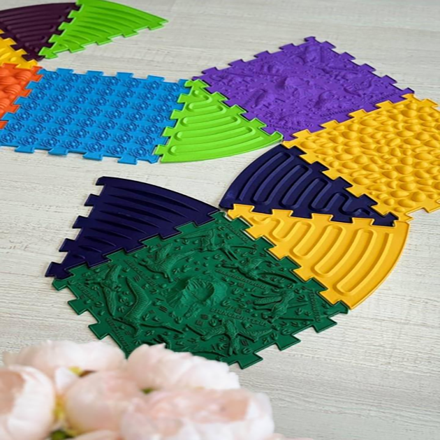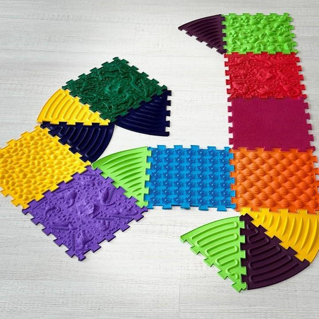 Цей масажний набір складається з 9 квадратних елементів (розміром 26×26 см) та 6 трикутних модулів (23×19 см), які легко поєднуються між собою у будь-якій конфігурації.