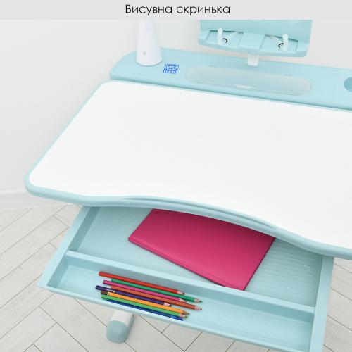 Модель дозволяє регулювати висоту та кут нахилу стільниці до 60°, адаптуючись під зріст і потреби дитини. Поверхню столу можна використовувати для малювання фломастерами на водній основі — вона легко очищується та практична в повсякденному використанні.
