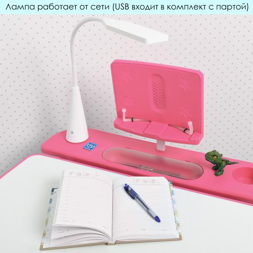 Парта оснащена зручною нішею під стільницею для зберігання книг і приладдя. В комплект входить LED лампа для комфортного освітлення та підставка для книг або планшета, яка обертається на 180°, забезпечуючи зручність під час читання.