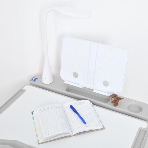 Вбудована підставка для книг дозволяє зручно розмістити навчальні матеріали, а лампа, що входить до комплекту, гарантує якісне освітлення навіть у вечірній час.