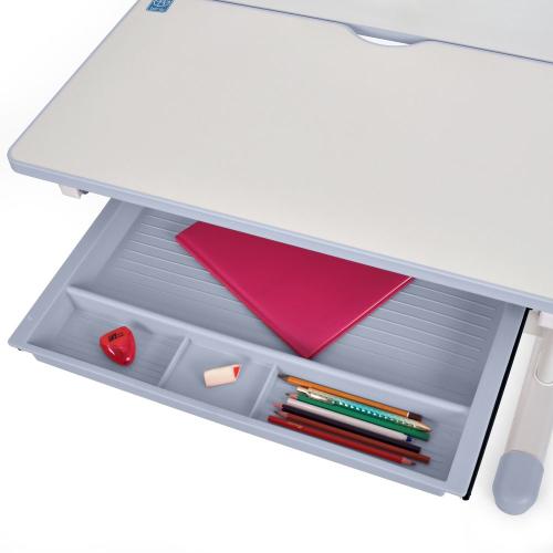 Комплект має сучасний вигляд і легко вписується в інтер’єр. Гладка поверхня стільниці приємна на дотик і підходить для письма, малювання та інших занять. Під стільницею передбачено практичний висувний ящик для зберігання зошитів, ручок і дрібних речей.
