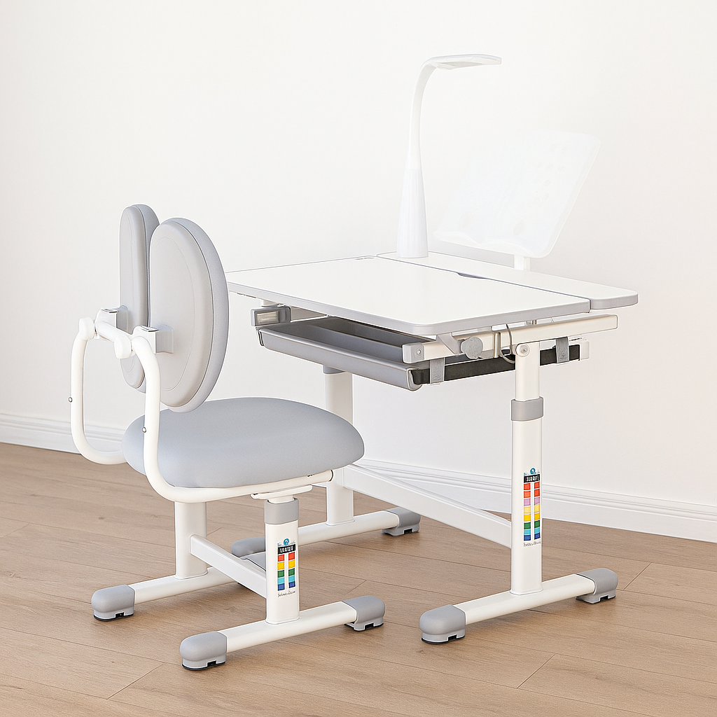 У комплекті – зручний стільчик і яскрава лампа. Регульована висота парти та сидіння дозволяє адаптувати їх під зріст дитини, забезпечуючи правильну поставу та комфорт під час використання.