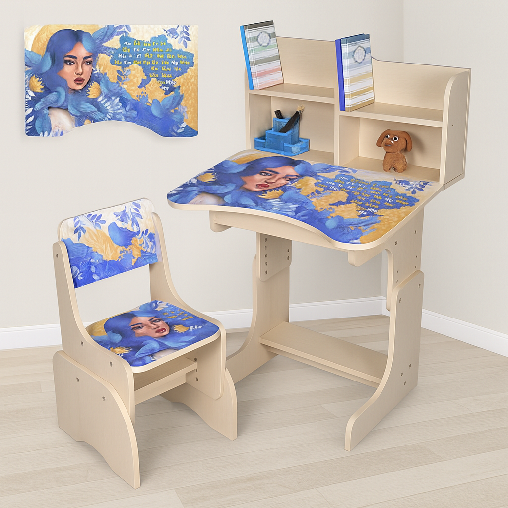 Стіл і стілець регулюються по висоті, що дозволяє налаштувати їх під зріст дитини для правильного положення тіла. Комплект створено з урахуванням зручності, ергономіки та потреб школярів.