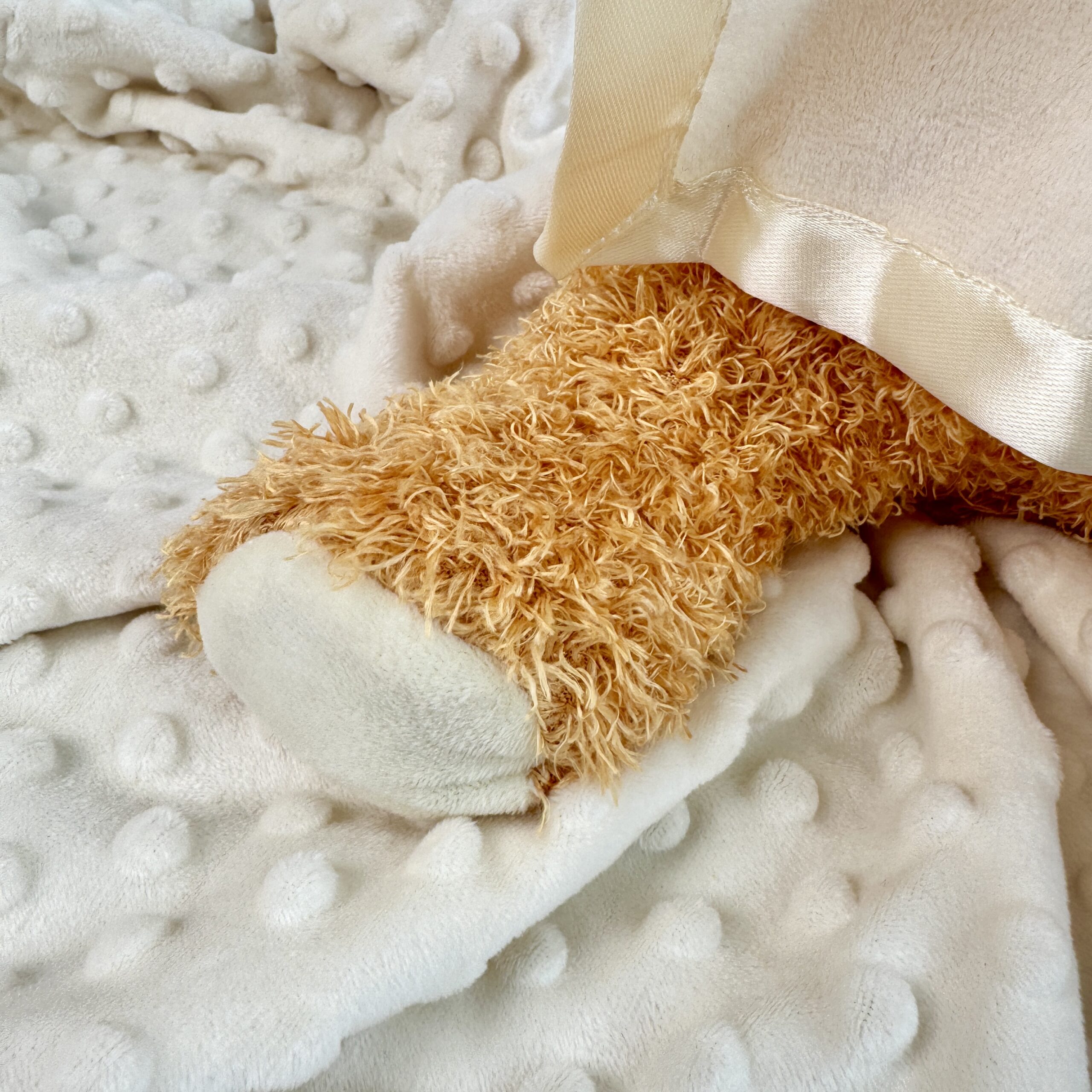 🔹 Реалістична взаємодія – м’яка іграшка оживає у руках малюка: піднімає ковдру, сміється, говорить.