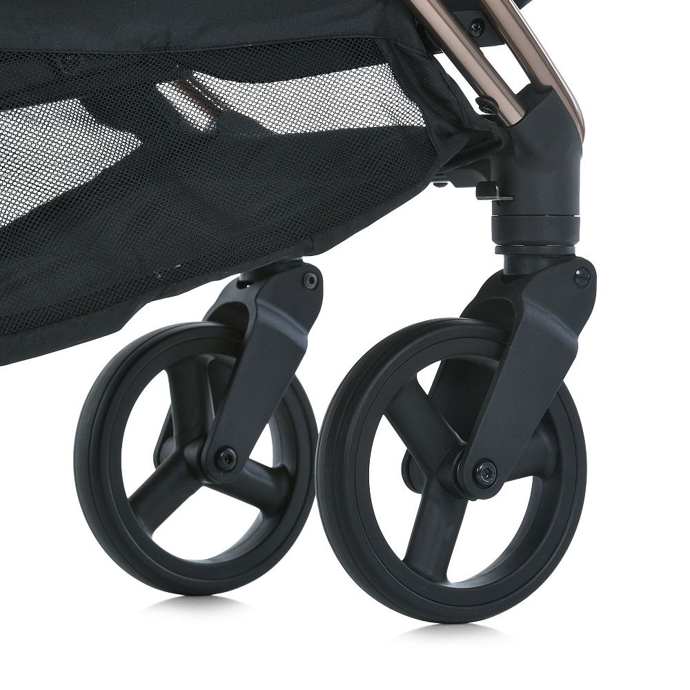 Поліуретанові колеса забезпечують плавний і безшумний рух: передні діаметром 16,5 см з амортизаторами для м’якого ходу, задні — 23 см для підвищеної стійкості. Така система коліс гарантує комфортне пересування навіть нерівними дорогами.