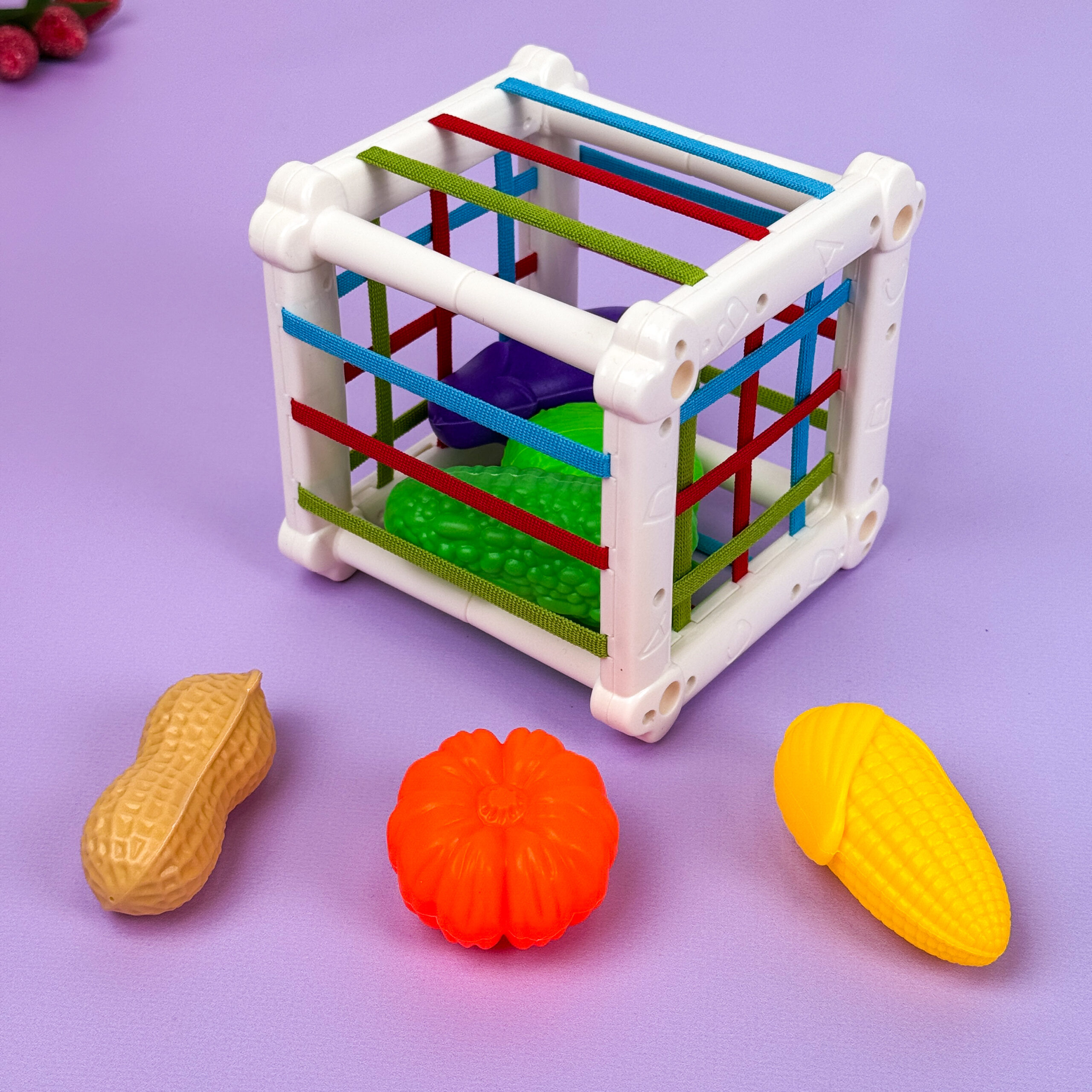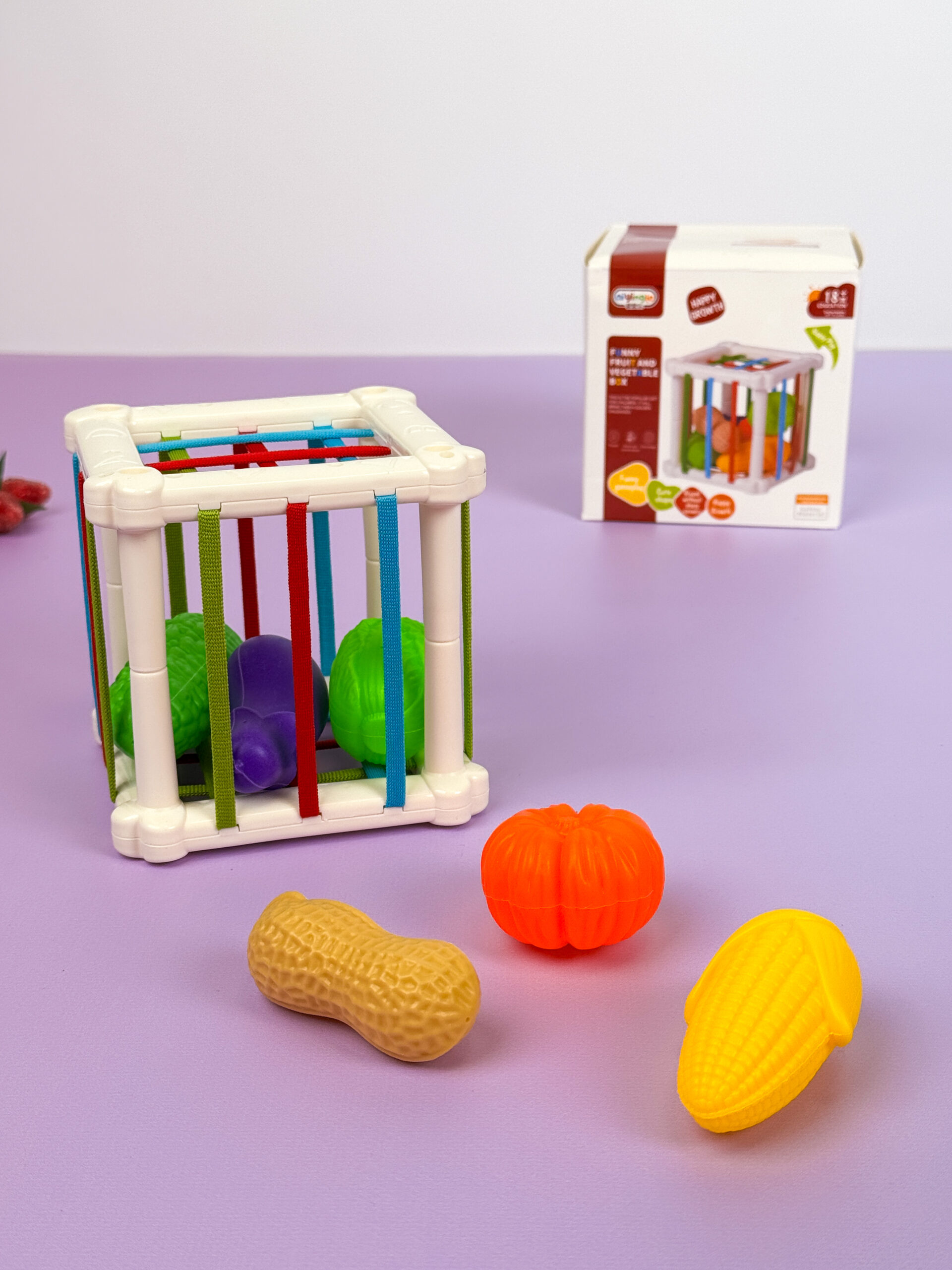 Яскрава та цікава тактильна іграшка-сортер у вигляді коробки з гумками — ідеальний подарунок для малюка! В комплект входять м’які пластикові овочі та фрукти, які потрібно витягати та вкладати крізь еластичні стрічки, розвиваючи координацію, логіку та дрібну моторику.