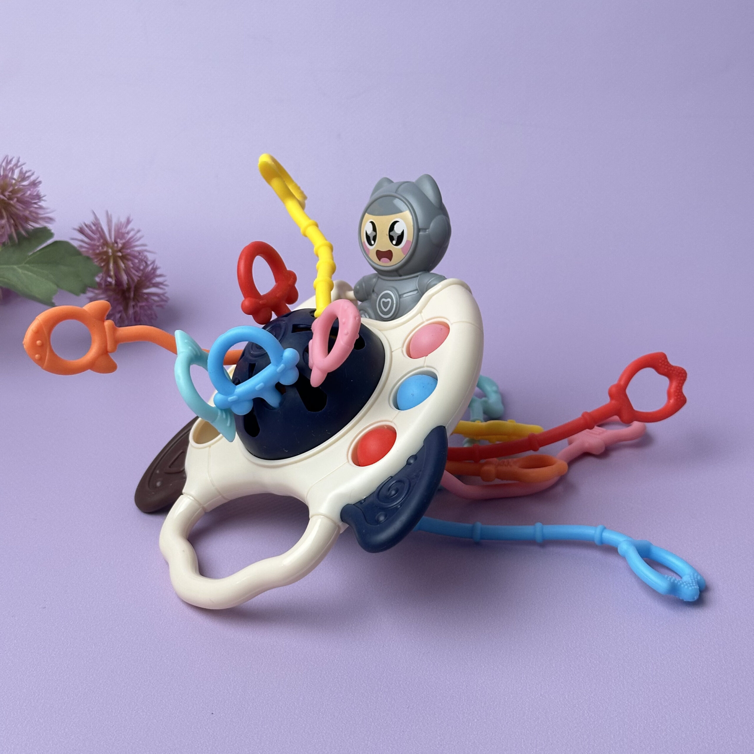 Центральна частина оснащена шістьма гумовими мотузочками з різною текстурою для тактильного розвитку