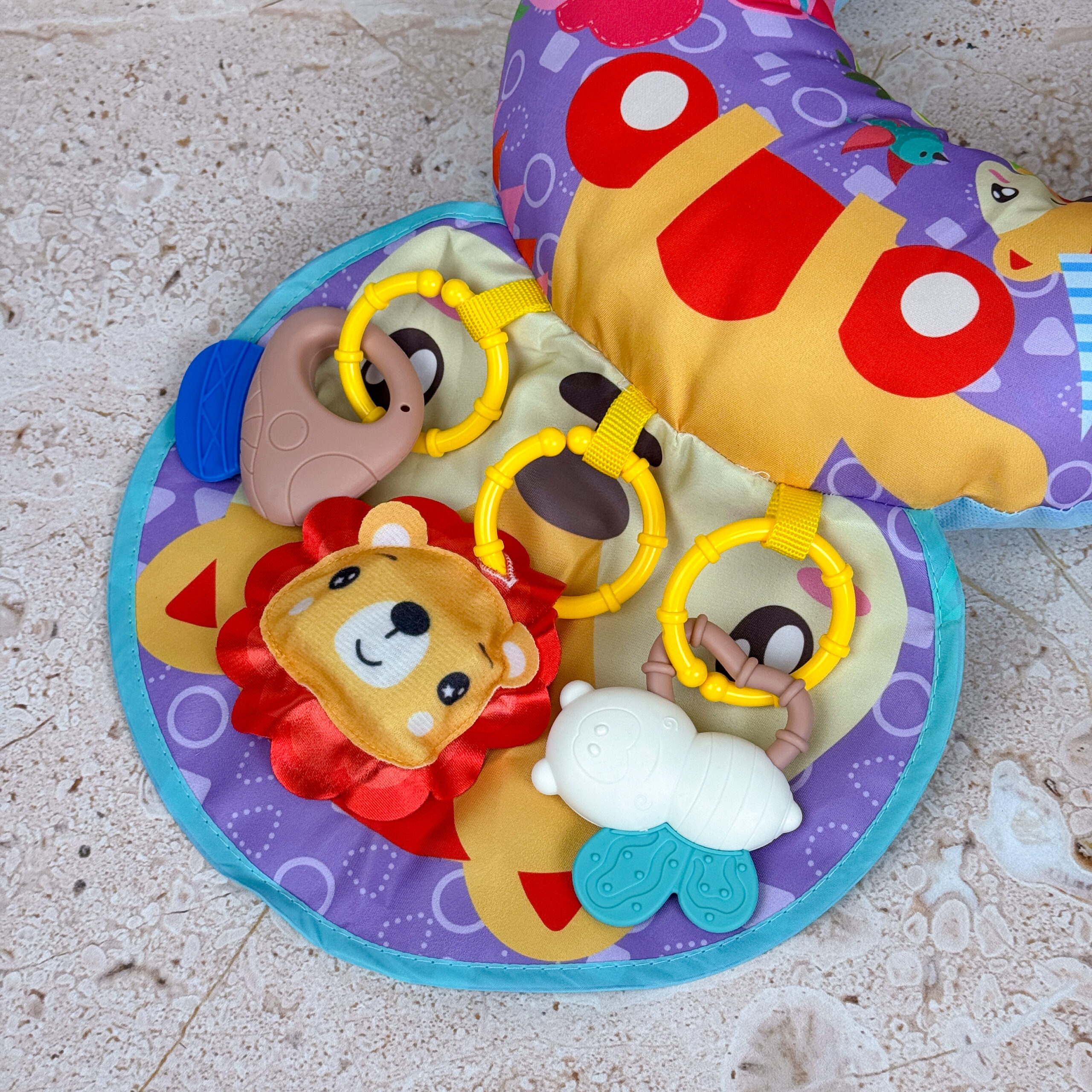 На корпусі цього яскравого килимка діти побачать барвисті зображення звірів, а також різнокольорові знімні брязкальця, видають кумедні звуки при струшуванні.