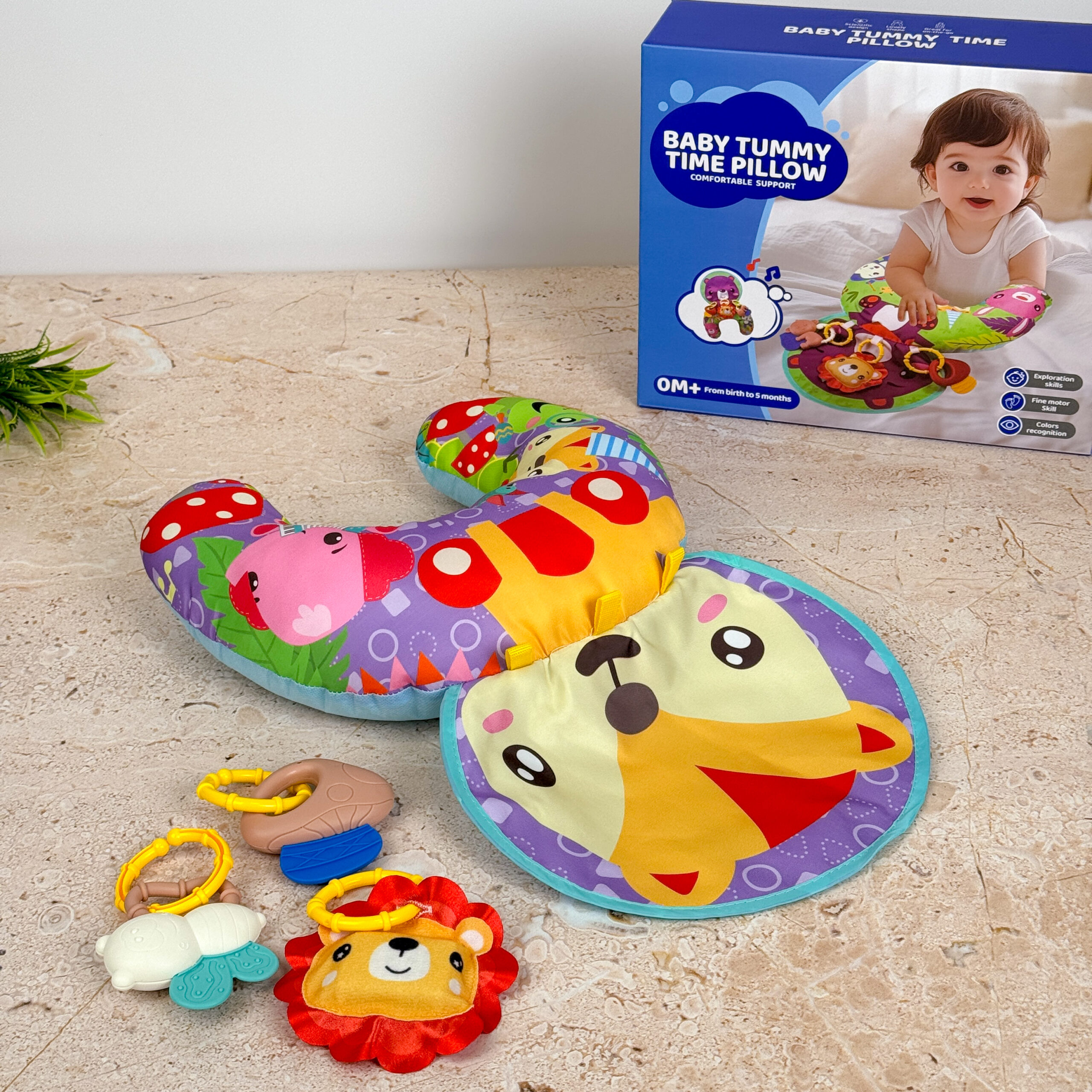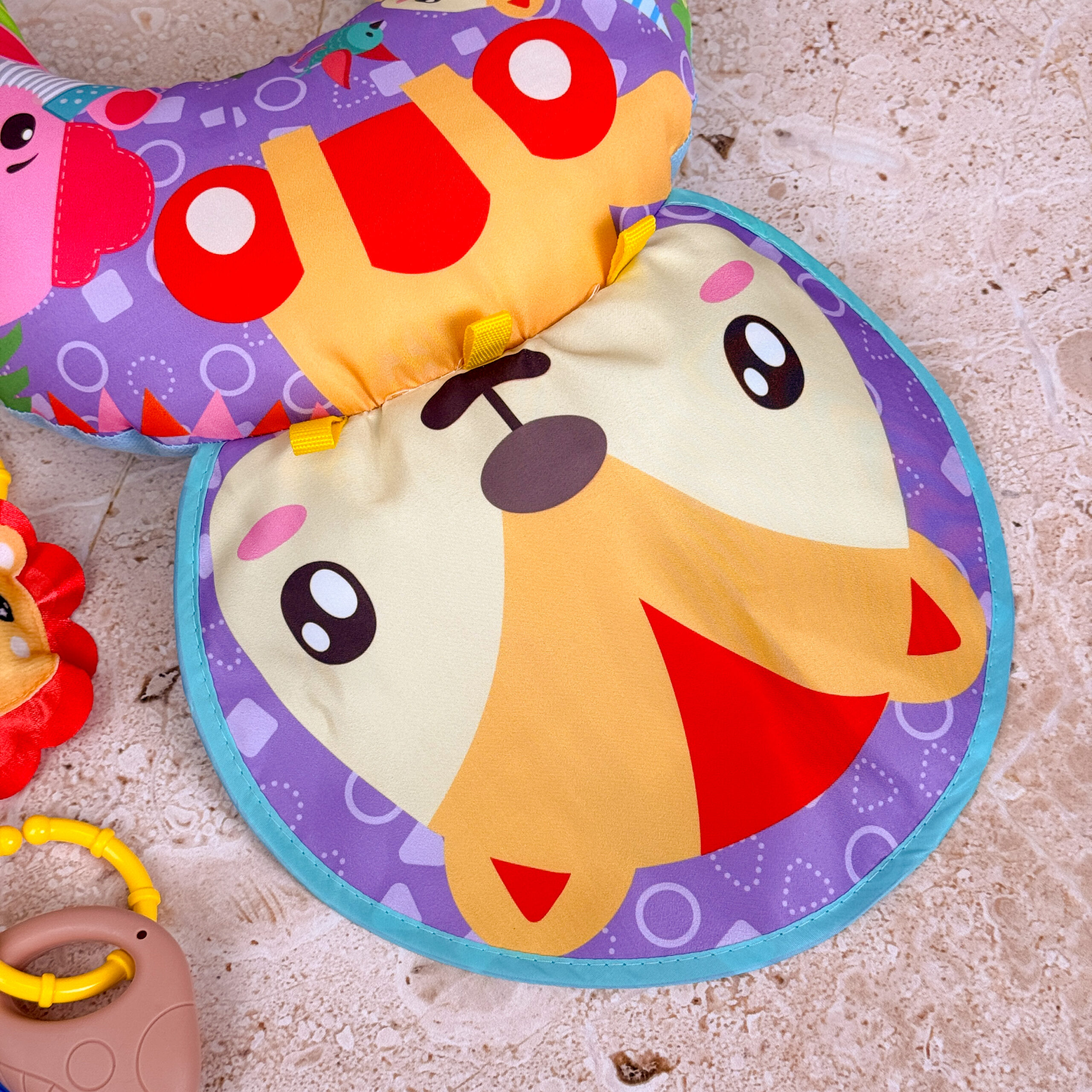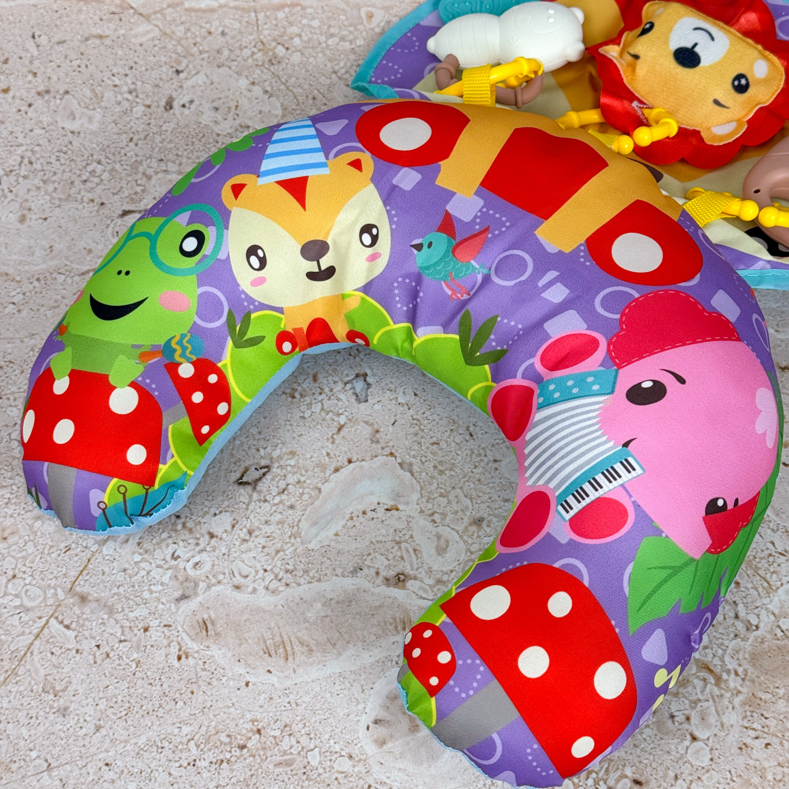 - Щоб малюку було зручно грати з ними, виріб доповнено м’якою подушечкою у формі півмісяця, на яку дитина може спертися.