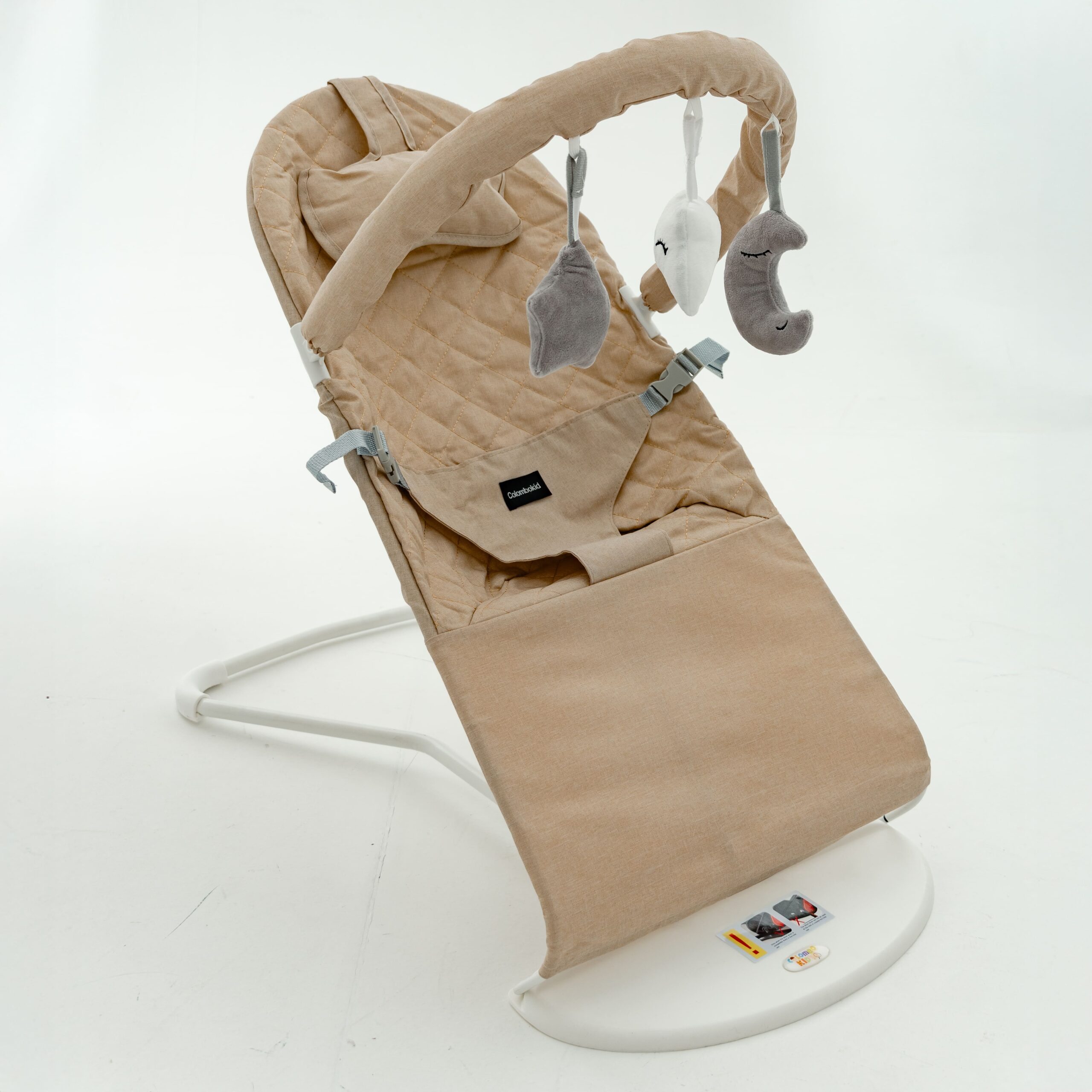Дитячий шезлонг-гойдалка **Colombokid** з дугою з дерев’яними іграшками та подушкою — ідеальний вибір для малюків з народження. Має м’яке покриття, забезпечує природне погойдувння і правильну підтримку для дітей до 15 кг.