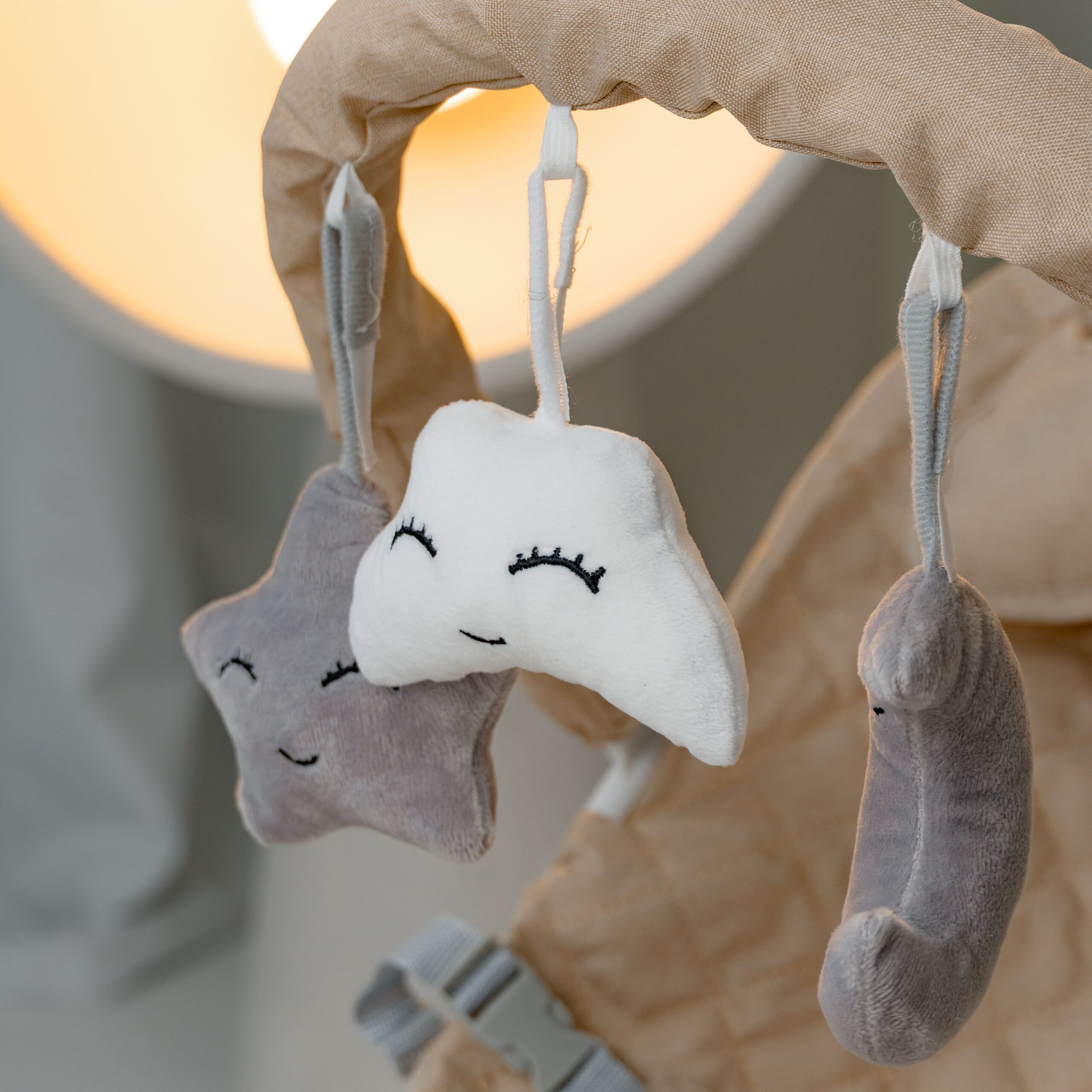 – Дуга з дерев’яними іграшками: Іграшки, що обертаються, стимулюють розвиток рухових навичок, а спокійна кольорова палітра допомагає малюку вивчати основні кольори. Іграшки надійно фіксуються, що виключає їх самостійне зняття.