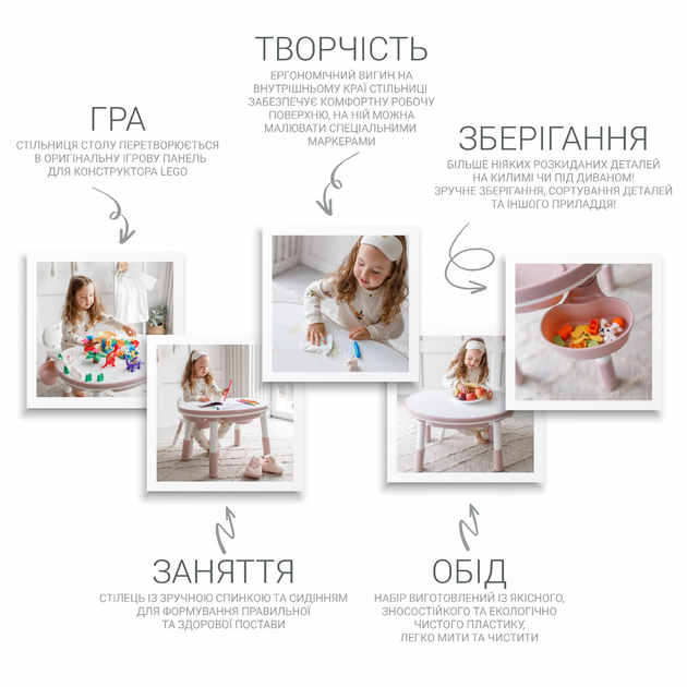 Шукаєте якісний дитячий столик зі стільчиком для навчання, творчості та ігор? Обирайте набір меблів від Коломбокід “Мультиплей Pink 6 в 1” — функціональні меблі, які ростуть разом із дитиною та легко трансформуються під будь-які потреби: