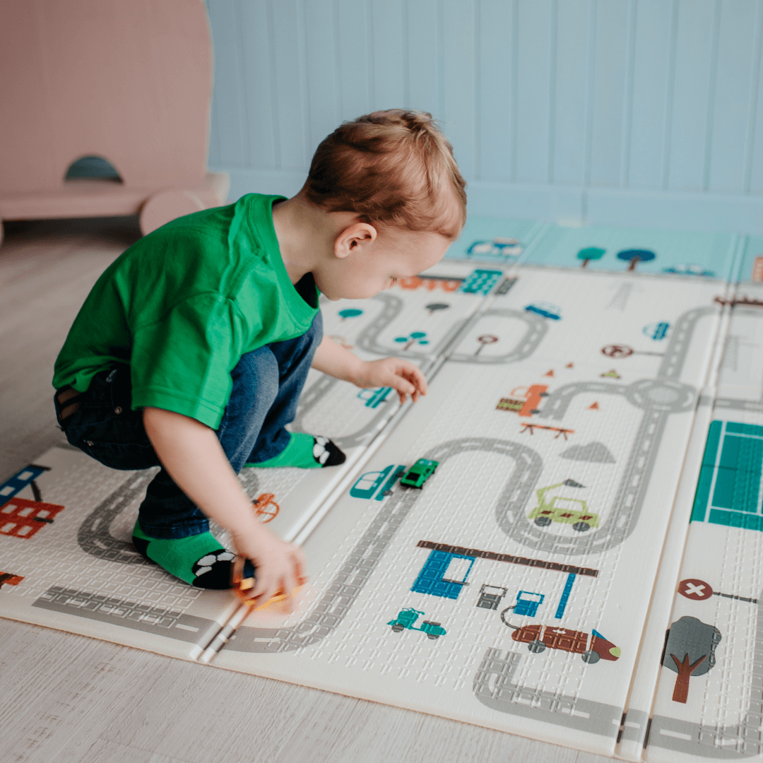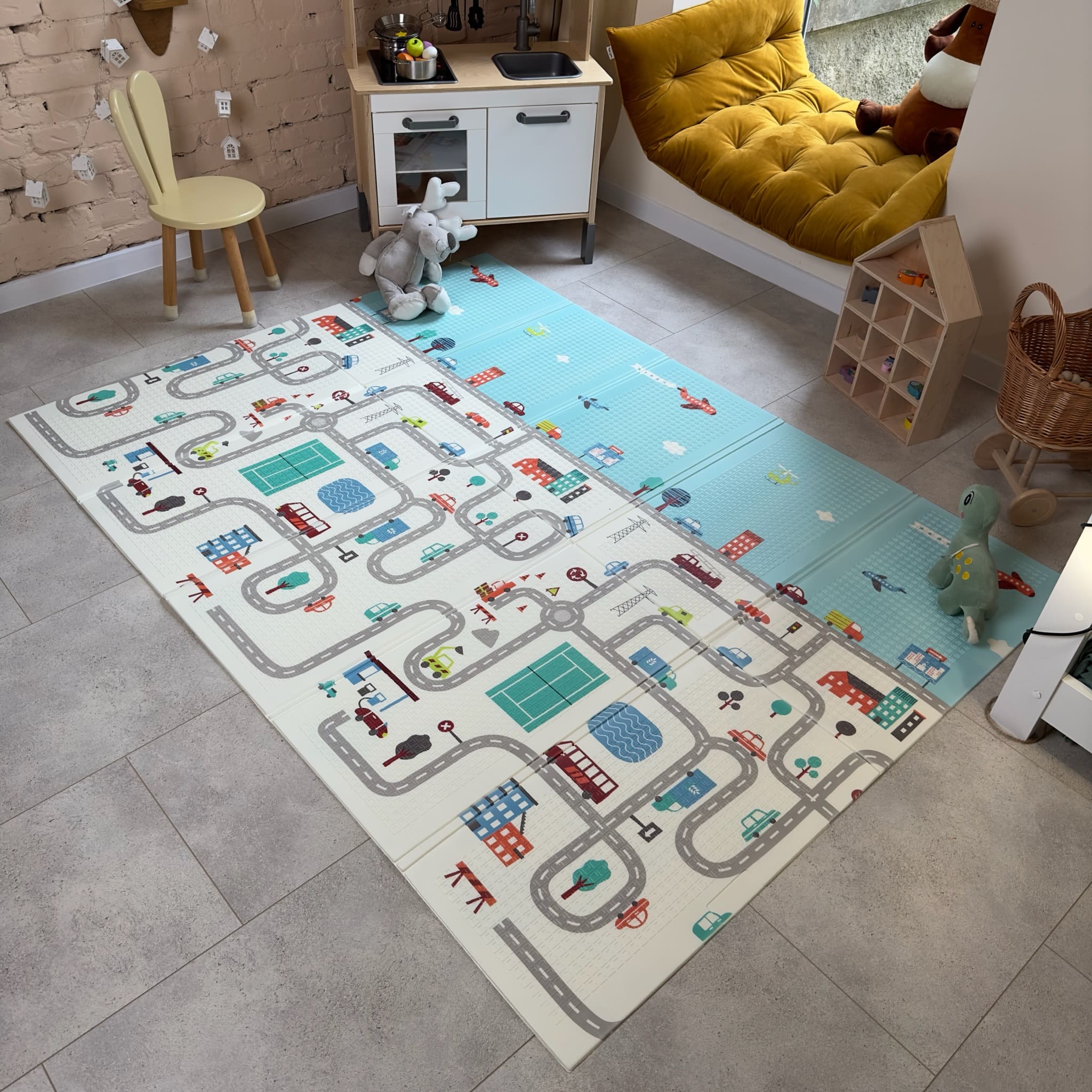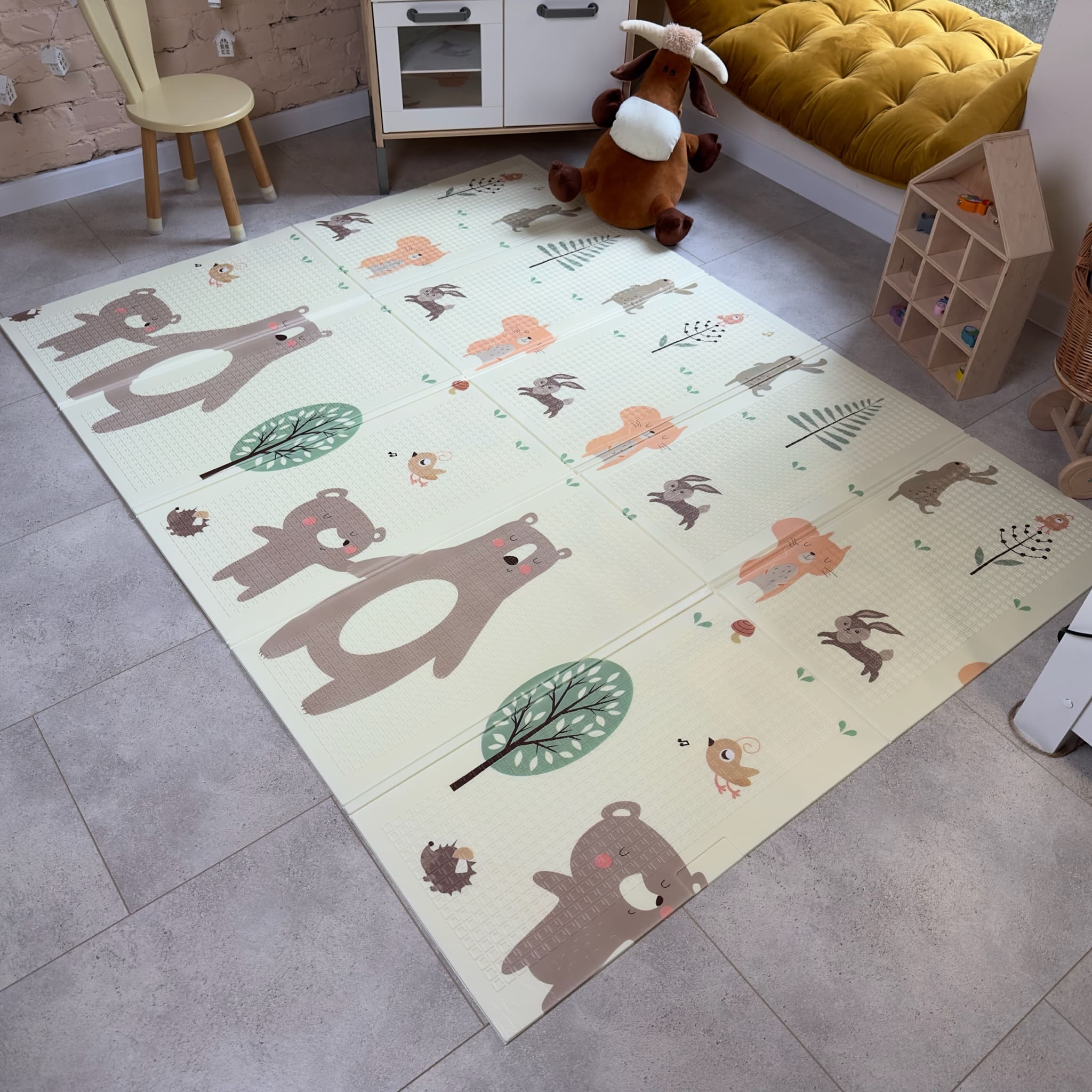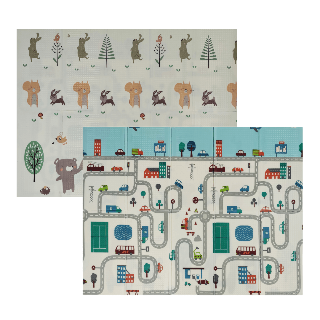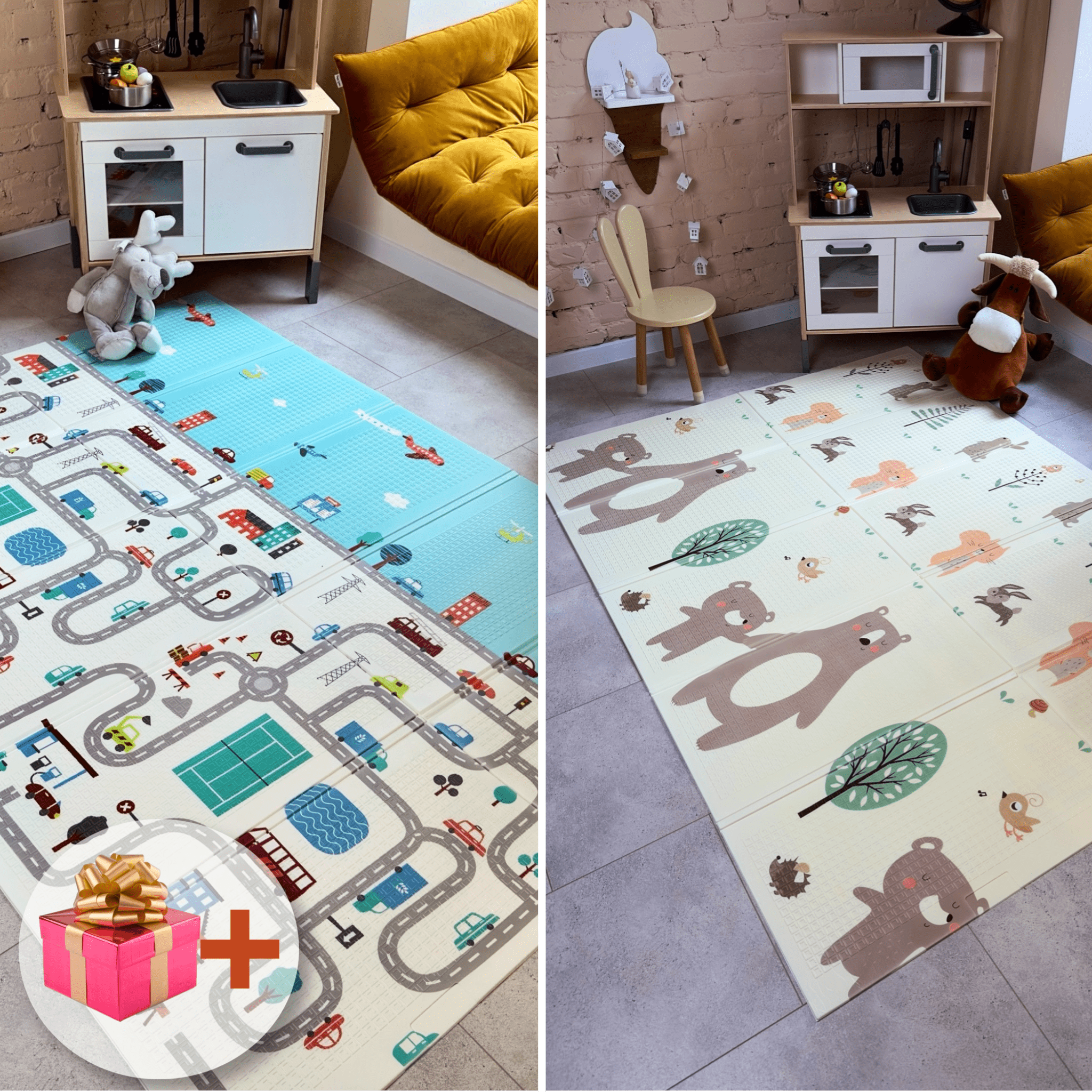 Двобічний малюнок на килимку допоможе легко оновити обставу в кімнаті, досить лише перевернути виріб. Ідеально підійде і хлопчикам, і дівчаткам та впишеться в будь-який інтер’єр. З однієї сторони зображена цікава дорога і місто, з іншої сторони казкові тварини в лісі. Такі малюнки термо коврика сприяють розвитку уяви у дитини , а структурна поверхня приємна для повзання та перших кроків малюка. Термо коврик- найкращий подарунок для малюка.
