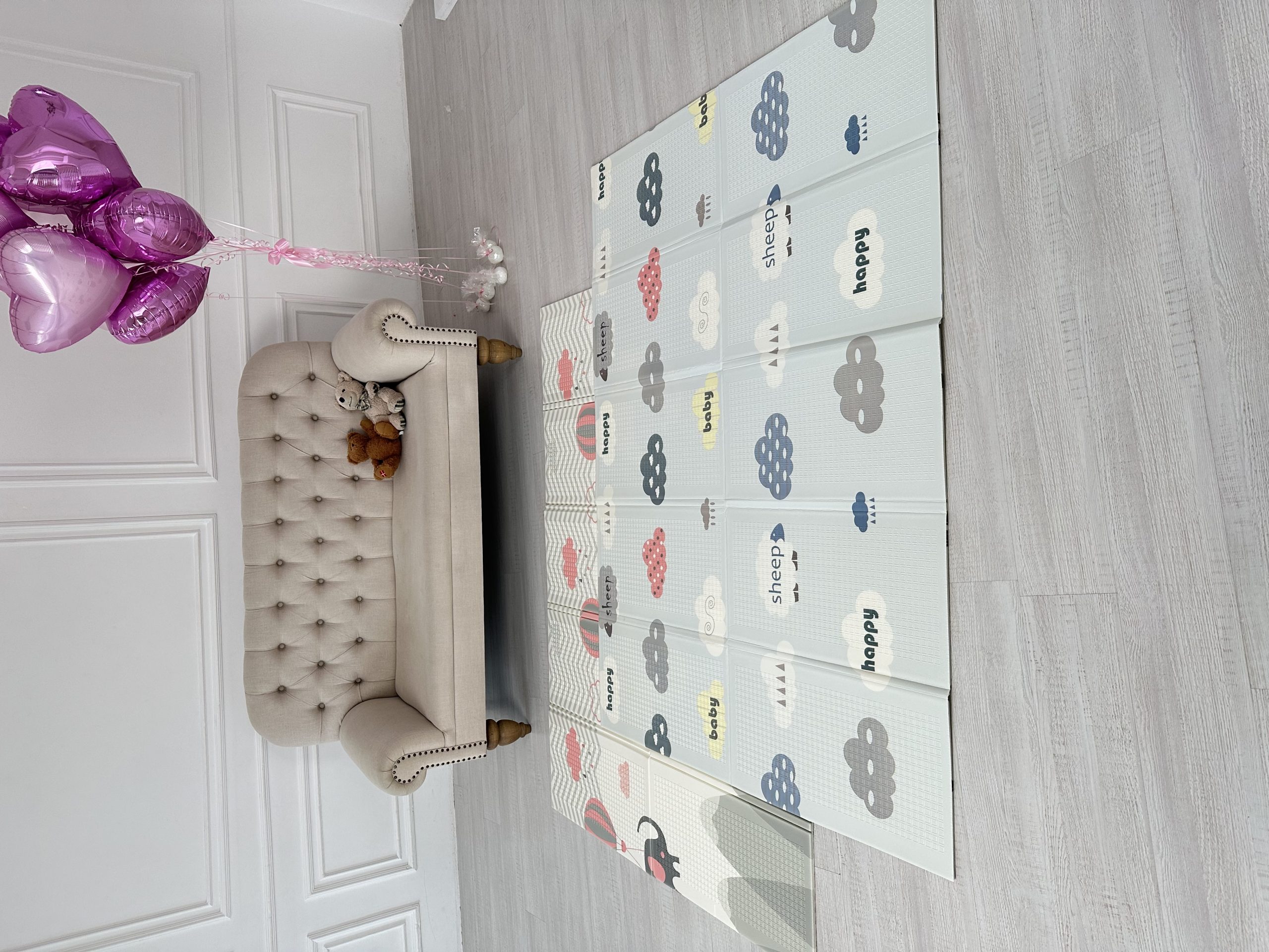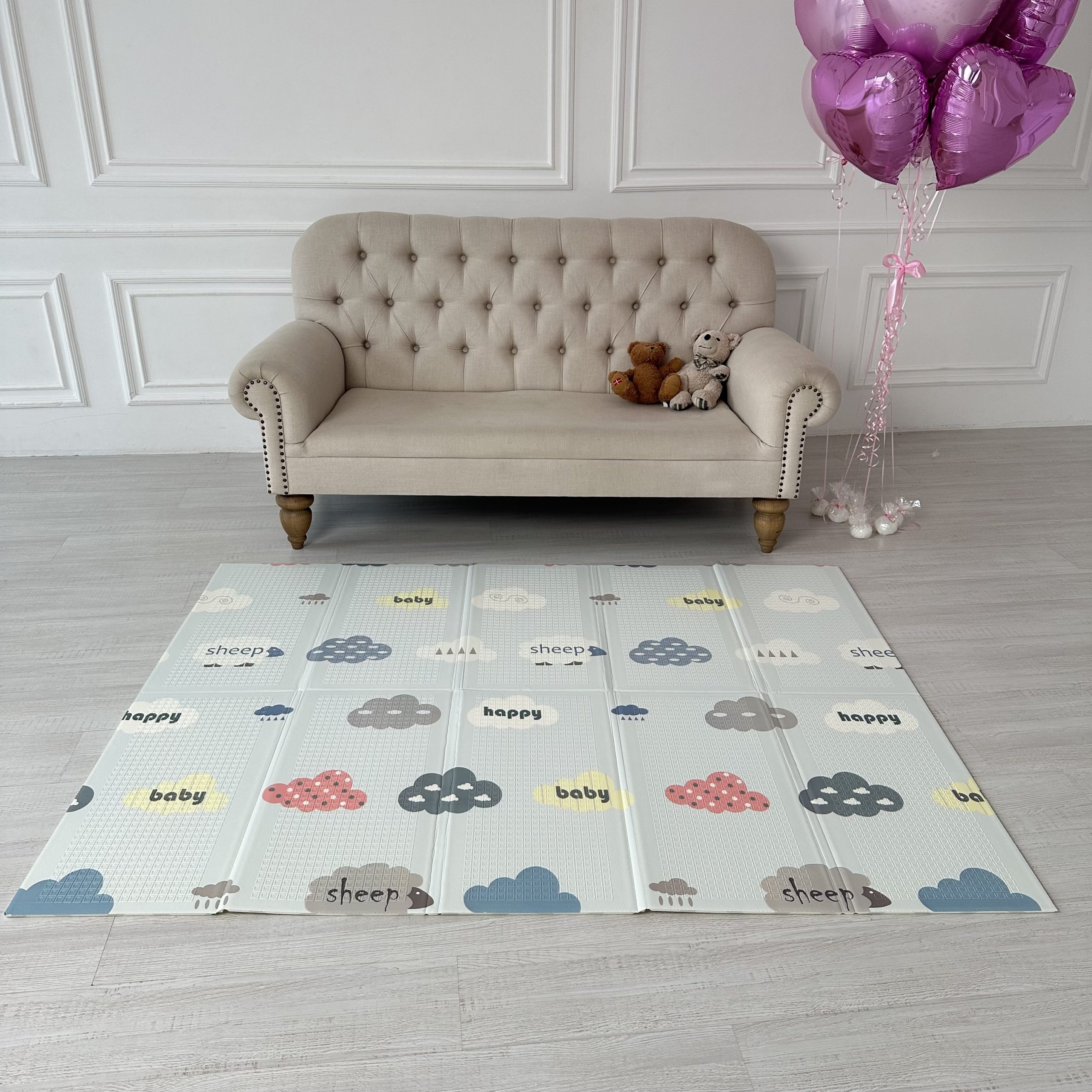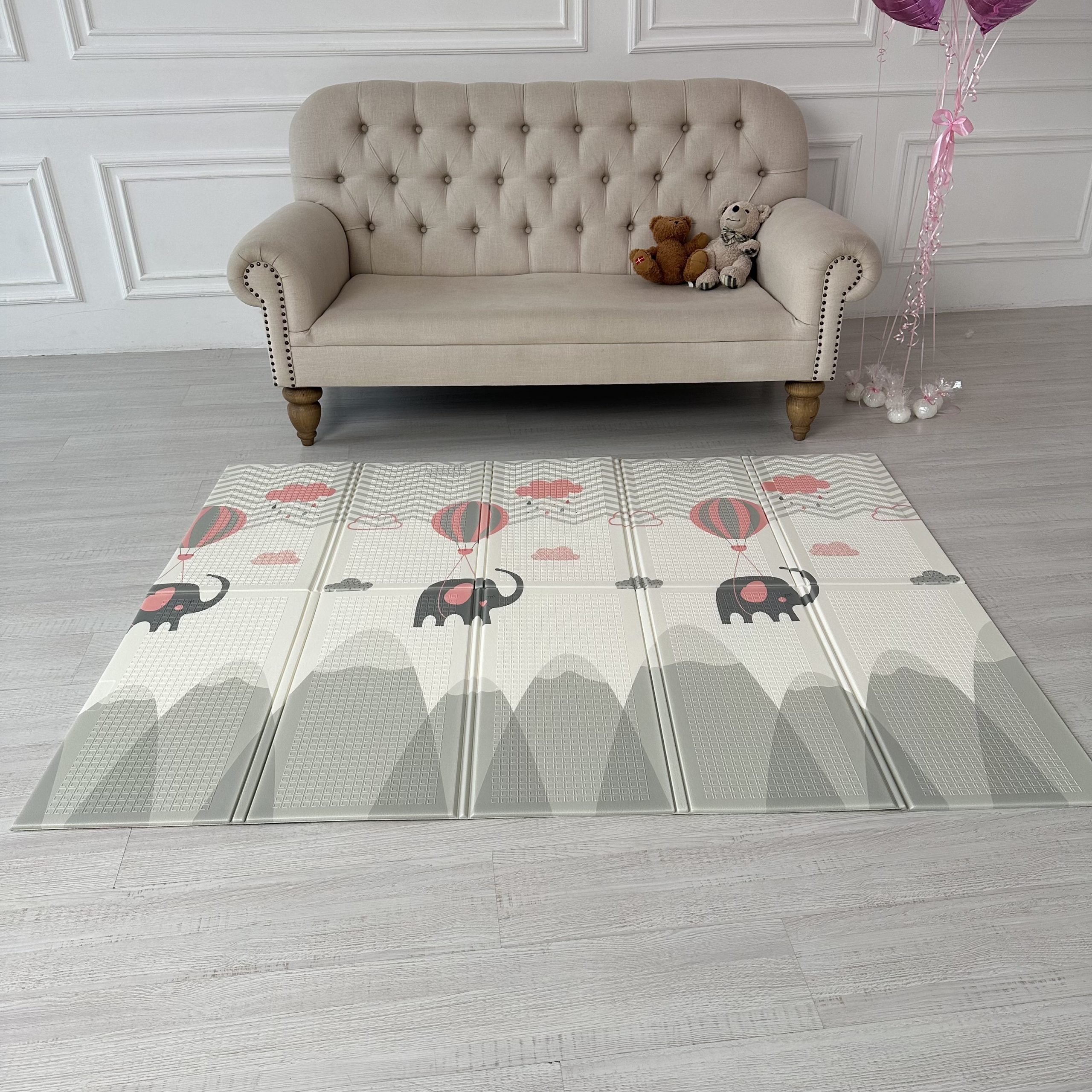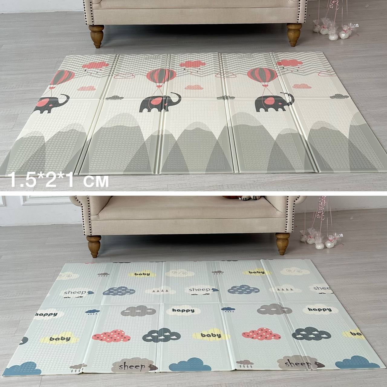 Термо килимок  складний дитячий “Слоненя та Хмаринки” розміром 2000х1500×10 мм – це ідеальний вибір для тих, хто цінує комфорт та практичність. Ідеальний дизайн підійде під будь-якого інтер’єру кімнати. Адже килимок двосторонній і має два різних малюнка.