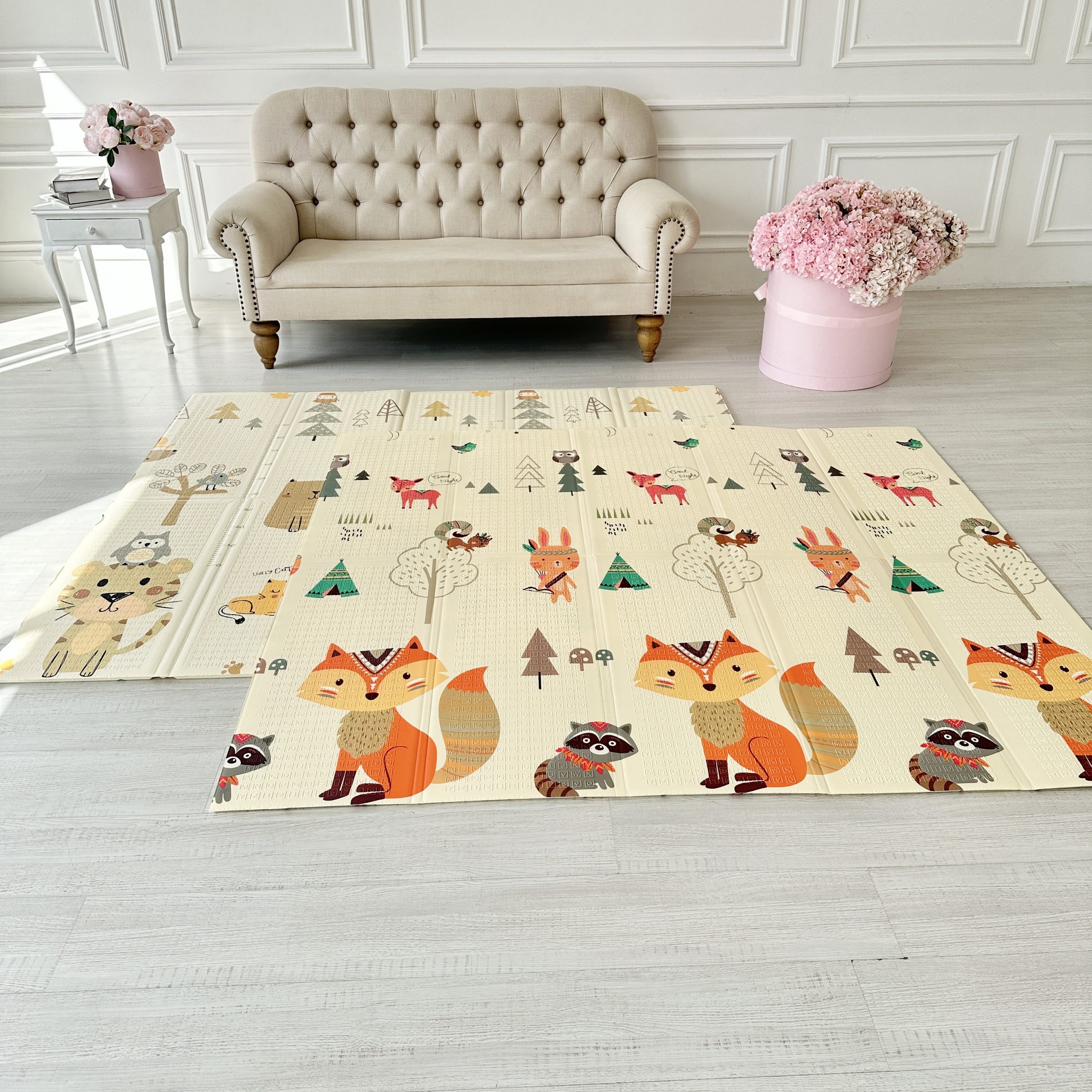 Cкладний термо килимок “Тигр і Лисичка” — це безпечна, комфортна, стильна зона для ігор і розвитку розміром 200х180×1 см. На кожному боці килимка зображені яскраві та життєрадісні тематичні малюнки які допоможуть у навчанні, пізнанні світу та розвитку, орієнтації в просторі й розвитку уяви.  Пастельні лами підійдуть під будь-який інтер’єр дитячої кімнати. Килимок має товщину 1.5 см та добре амортизує і не пропускає холод. Сумка для зберігання в комплекті.