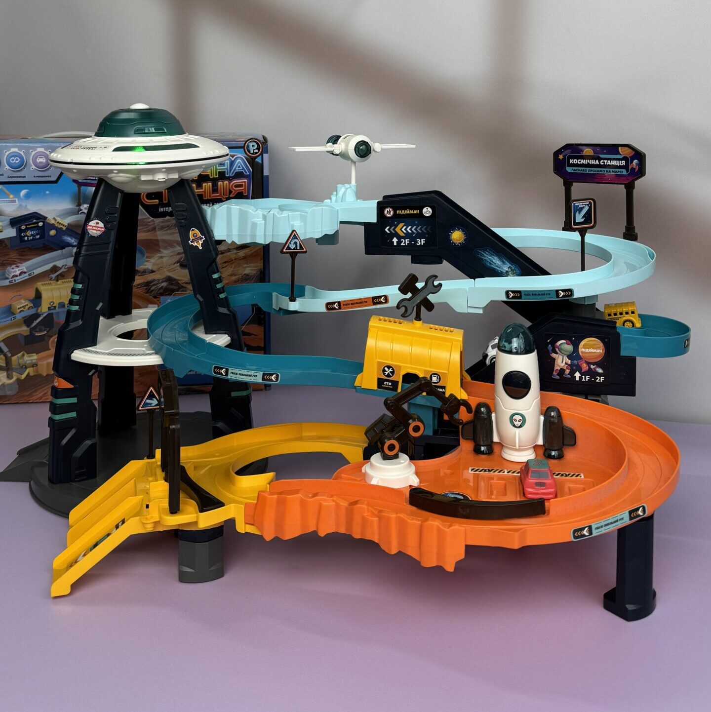 Трек WToys “Космічна станція” – трирівнева станція з підсвіткою, піснею, машинками, UFO-ефектом, з озвученням українською