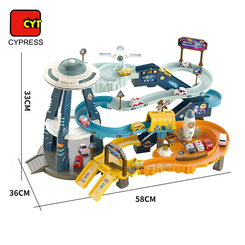 Цей яскравий трирівневий трек перенесе дитину у фантастичний світ міжпланетних пригод. У наборі — цілий арсенал елементів: літаюча тарілка зі світловими та звуковими ефектами, шатл, космічна станція та 4 швидкісні машинки, що мчать вниз по спіралі, долаючи повороти та спуски.